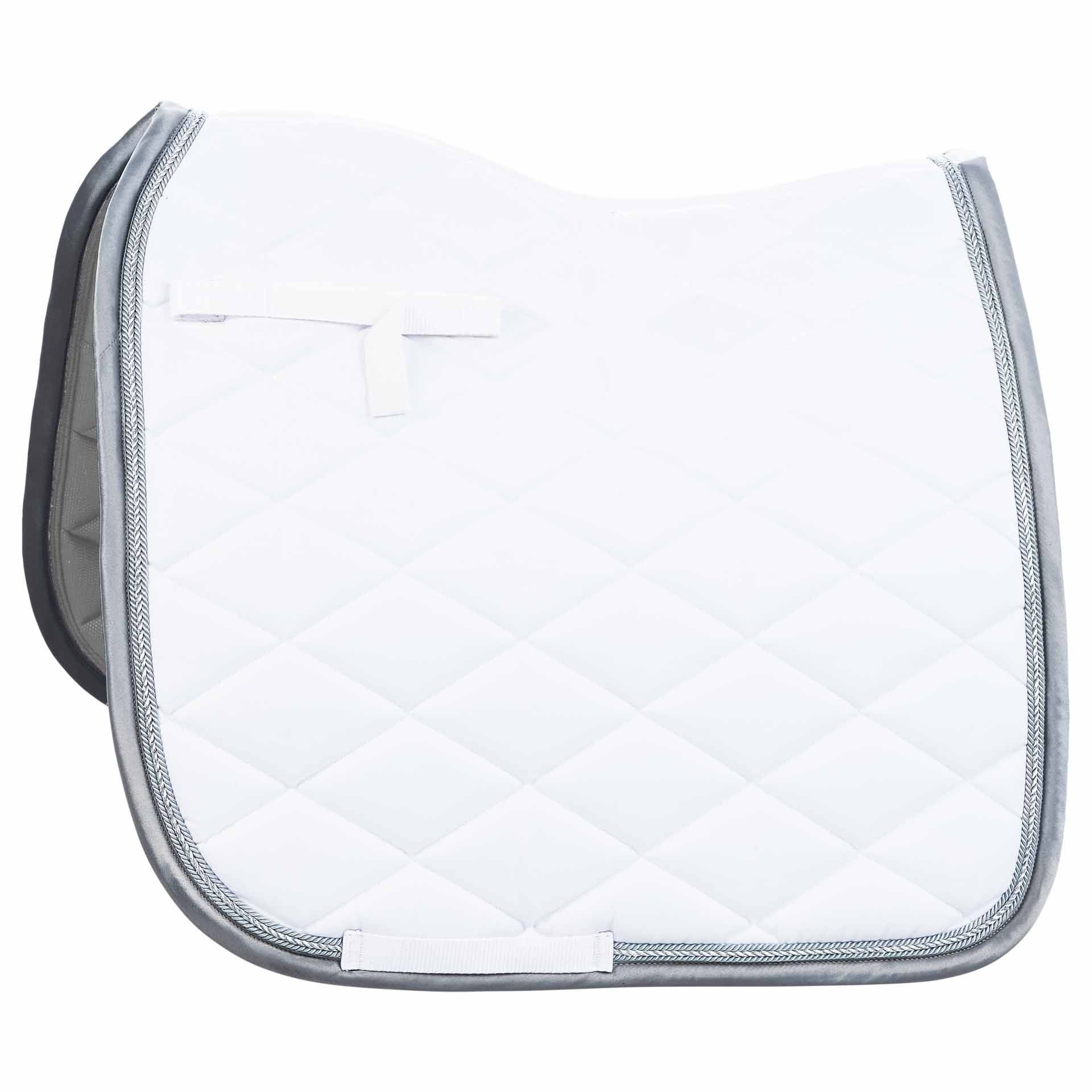 Présentant une conception classique avec une couture en forme de diamants, cette chabraque est dotée d'une liberté de garrot particulièrement élevée, intégrée profondément dans le dos, offrant ainsi un plus grand confort à ton cheval. En plus de son design attrayant, elle possède des applications en silicone qui empêchent la chabraque de glisser sous la selle, augmentant ainsi la sécurité lors de chaque promenade. Trois cordes élégantes et un ruban de satin bordent ce tapis de selle fait en polyester robuste.