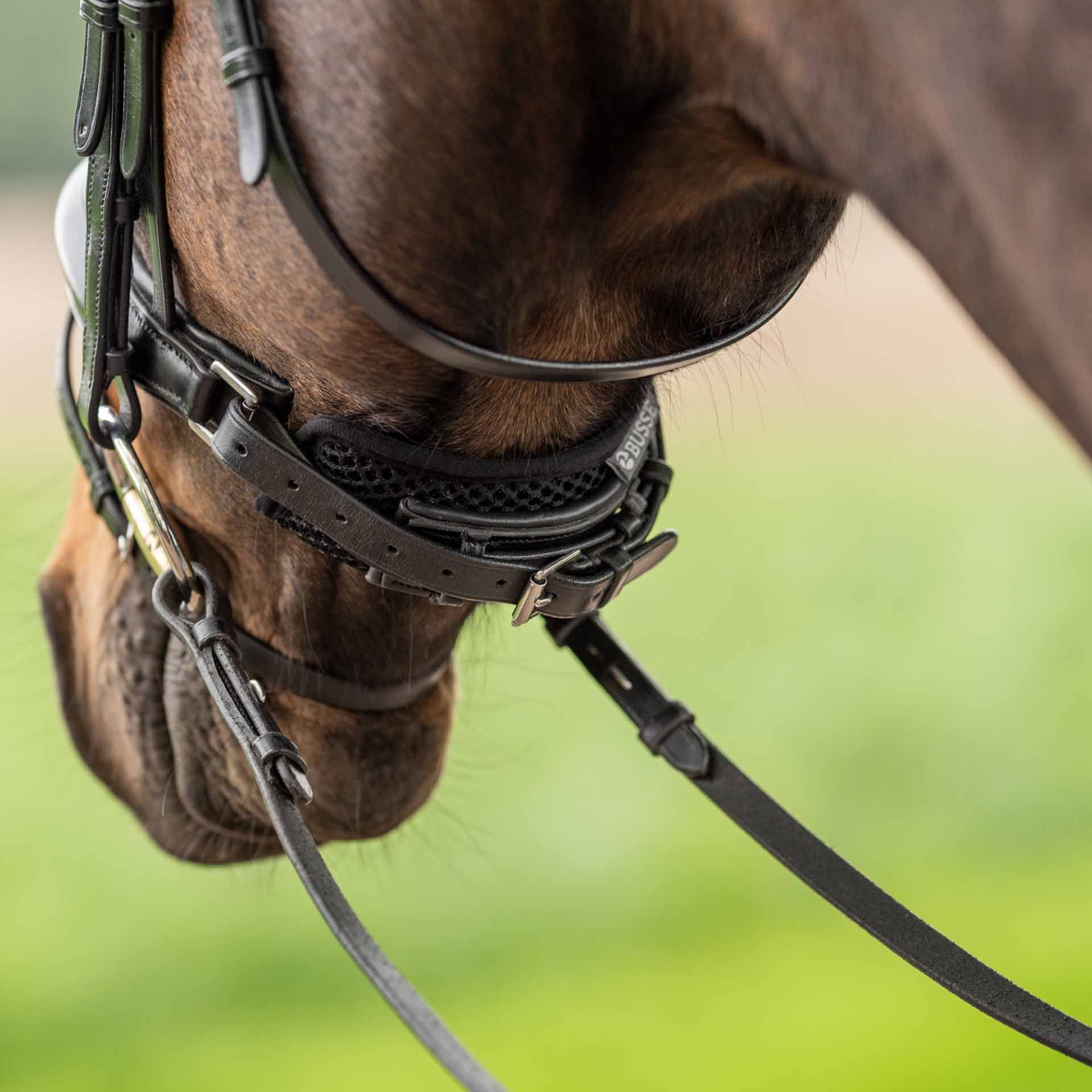 - for the ideal padding of the noseband in the area of ??the lower jaw to improve pressure distribution while maintaining air circulation and the associated protection of skin and coat