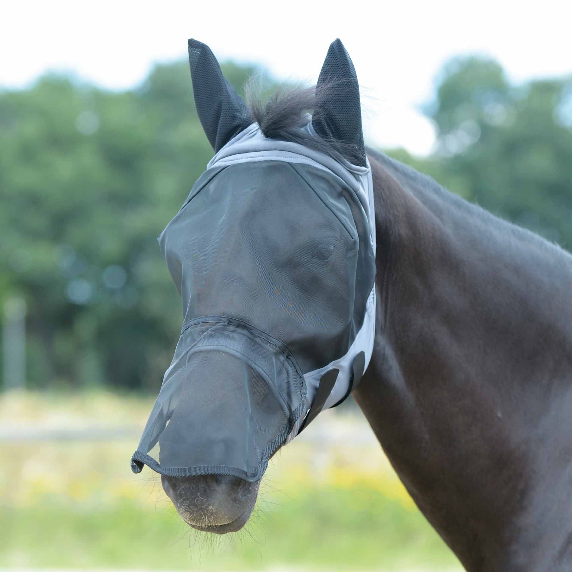 Réponse : Ce masque dispose d'un capuchon en Lycra®-nylon doux et élastique, d'oreilles en maille douce pour une bonne ventilation, et d'une protection généreuse des yeux et des naseaux. Il possède également une zone pour la crinière pour un confort supplémentaire.