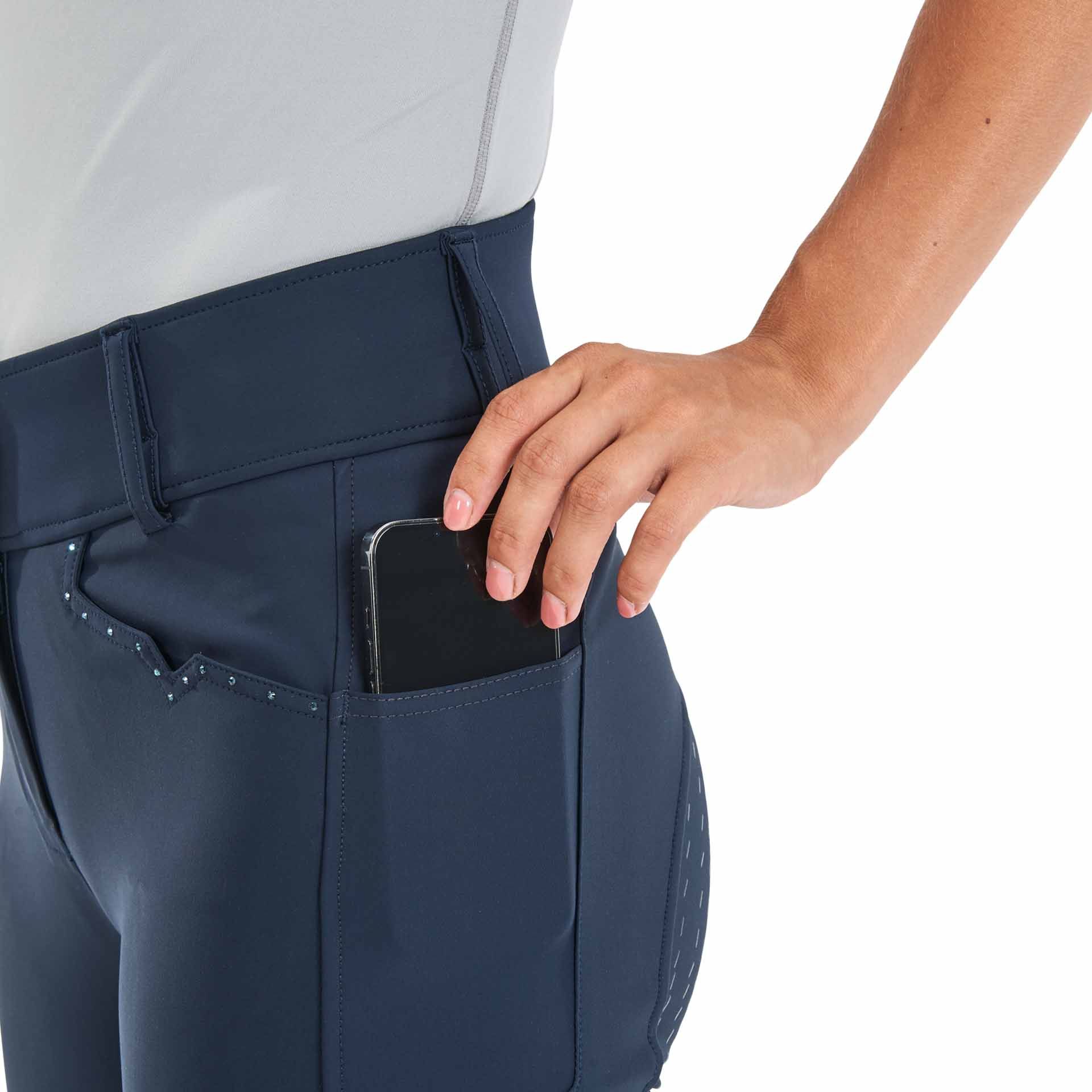 Réponse : Le Pantalon d'équitation BUSSE ADORA se distingue par son matériau fonctionnel hautement élastique, ses poches d'insertion sur les côtés des cuisses pour smartphones, ses poches avant indiquées visuellement et ornées de strass, et son impression en silicone scintillante sur la poche du smartphone.