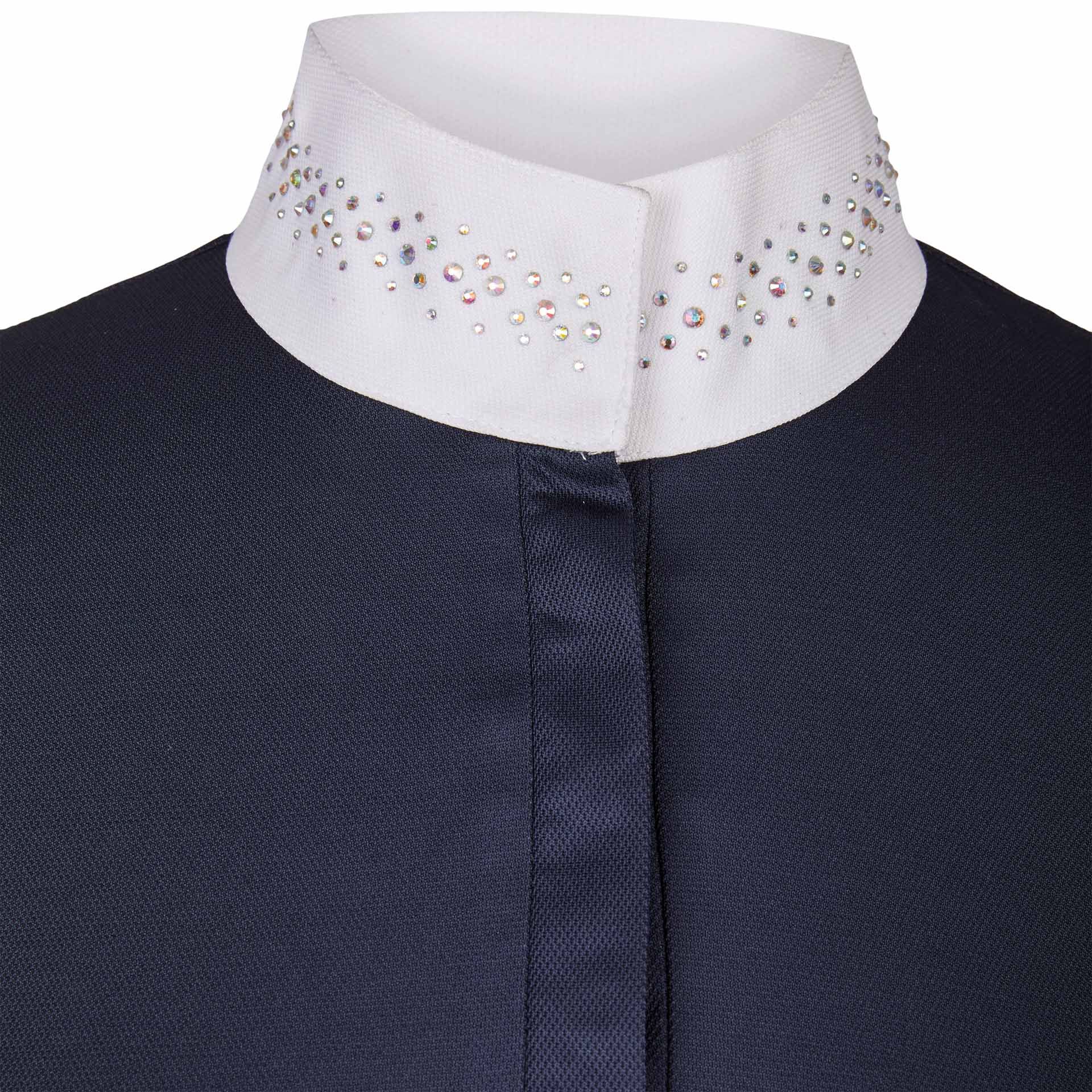 Ce t-shirt est doté d'un col orné de pierres de strass multicolores qui brillent et scintillent sous la lumière, ajoutant une touche de glamour à ton look équestre. Il dispose également d'une patte de boutonnage cachée avec trois boutons et d'un col montant qui se ferme discrètement avec des boutons-pression à l'avant.