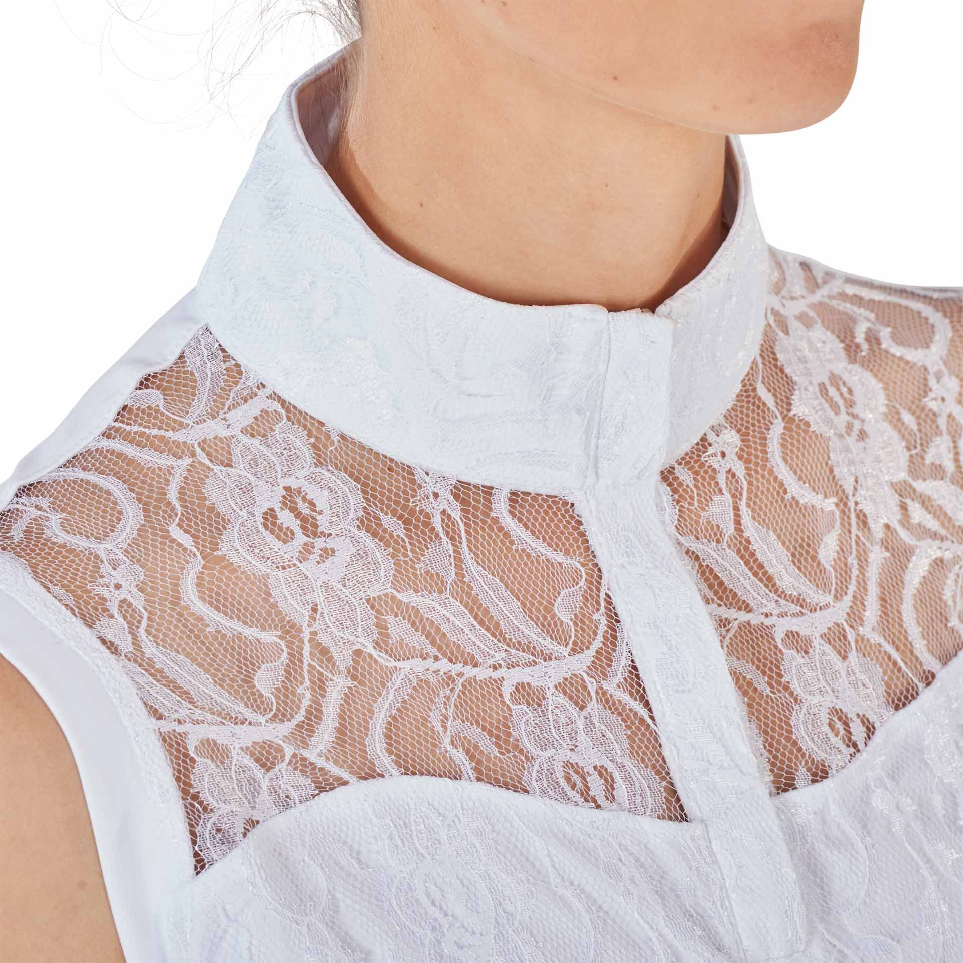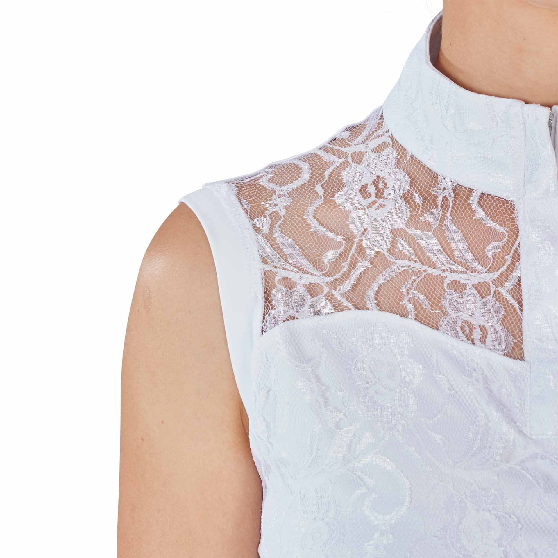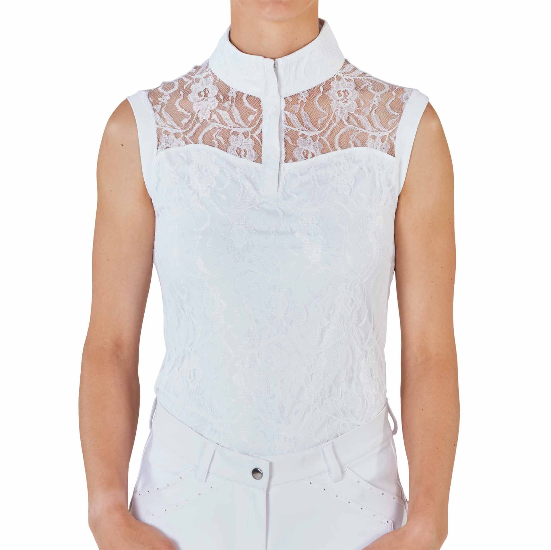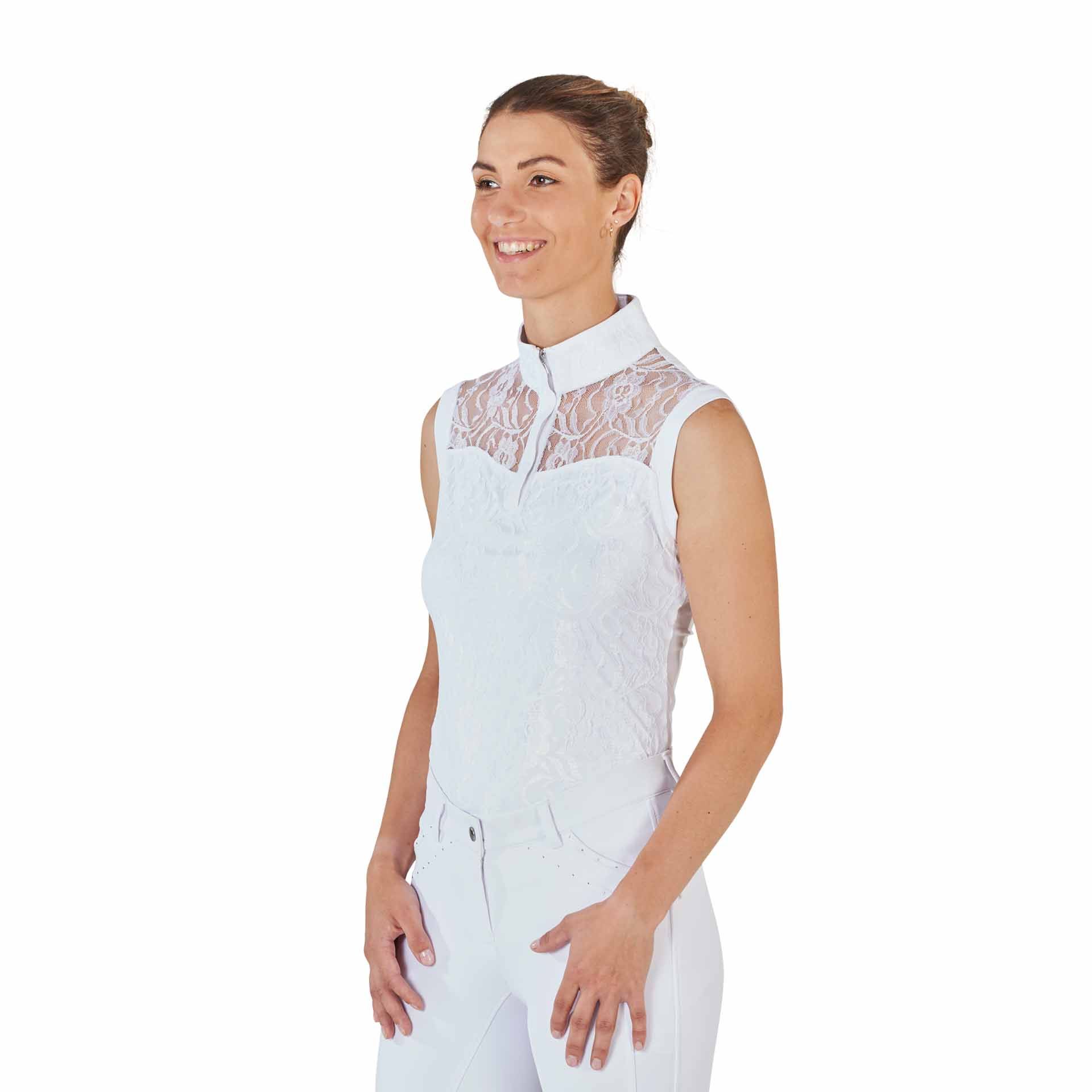Découvrez le T-shirt de concours BUSSE AMADORA, sans manches, un vêtement élégant mêlant féminité et dentelle. Avec son col montant fermé par une fermeture éclair dissimulée à l'avant, ce t-shirt est parfait pour les compétitions équestres.