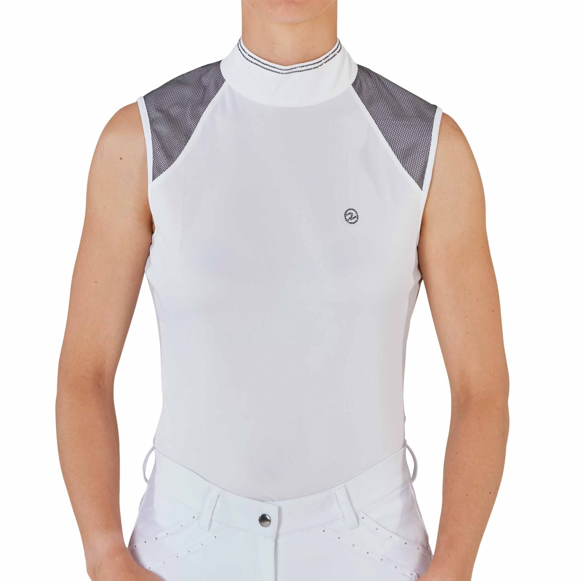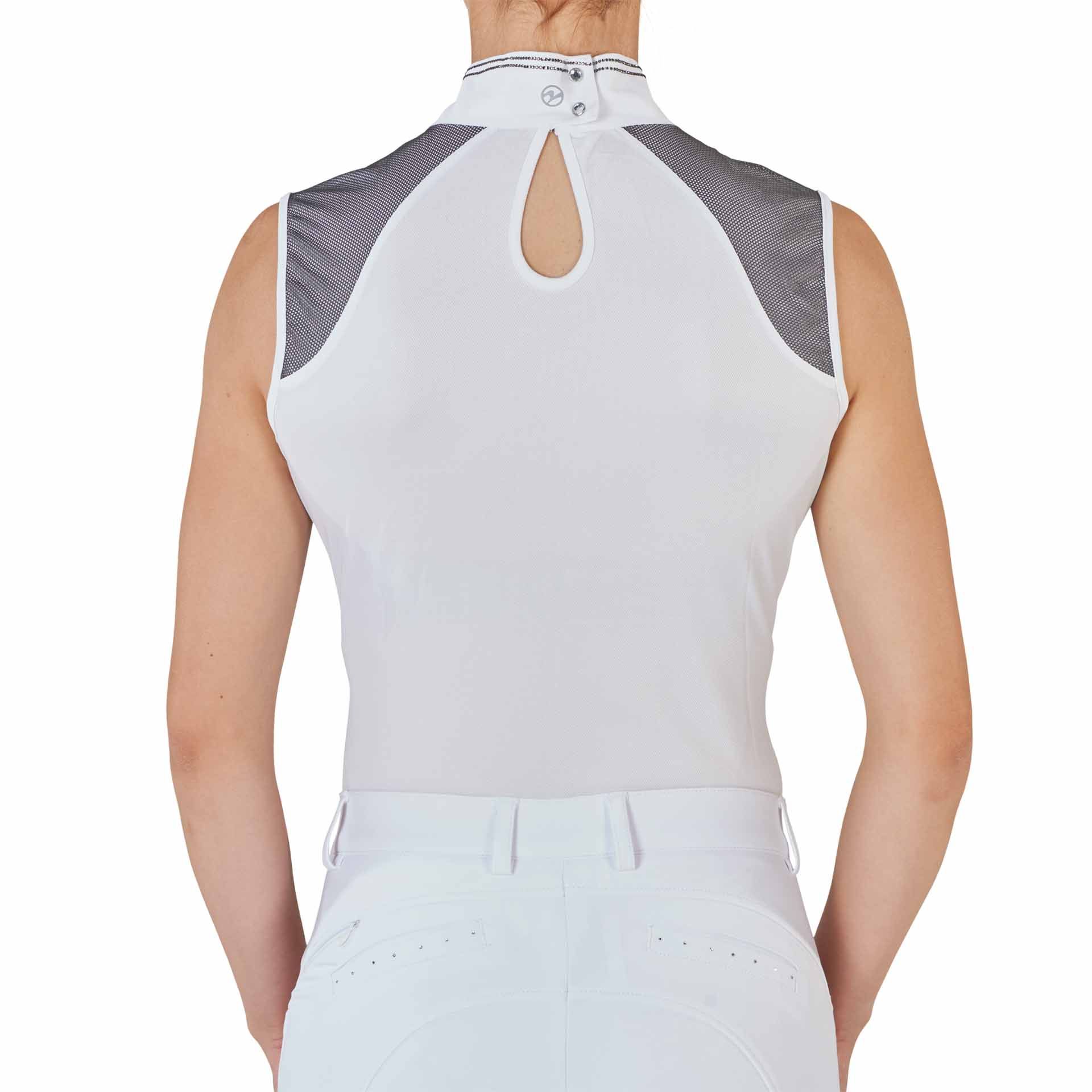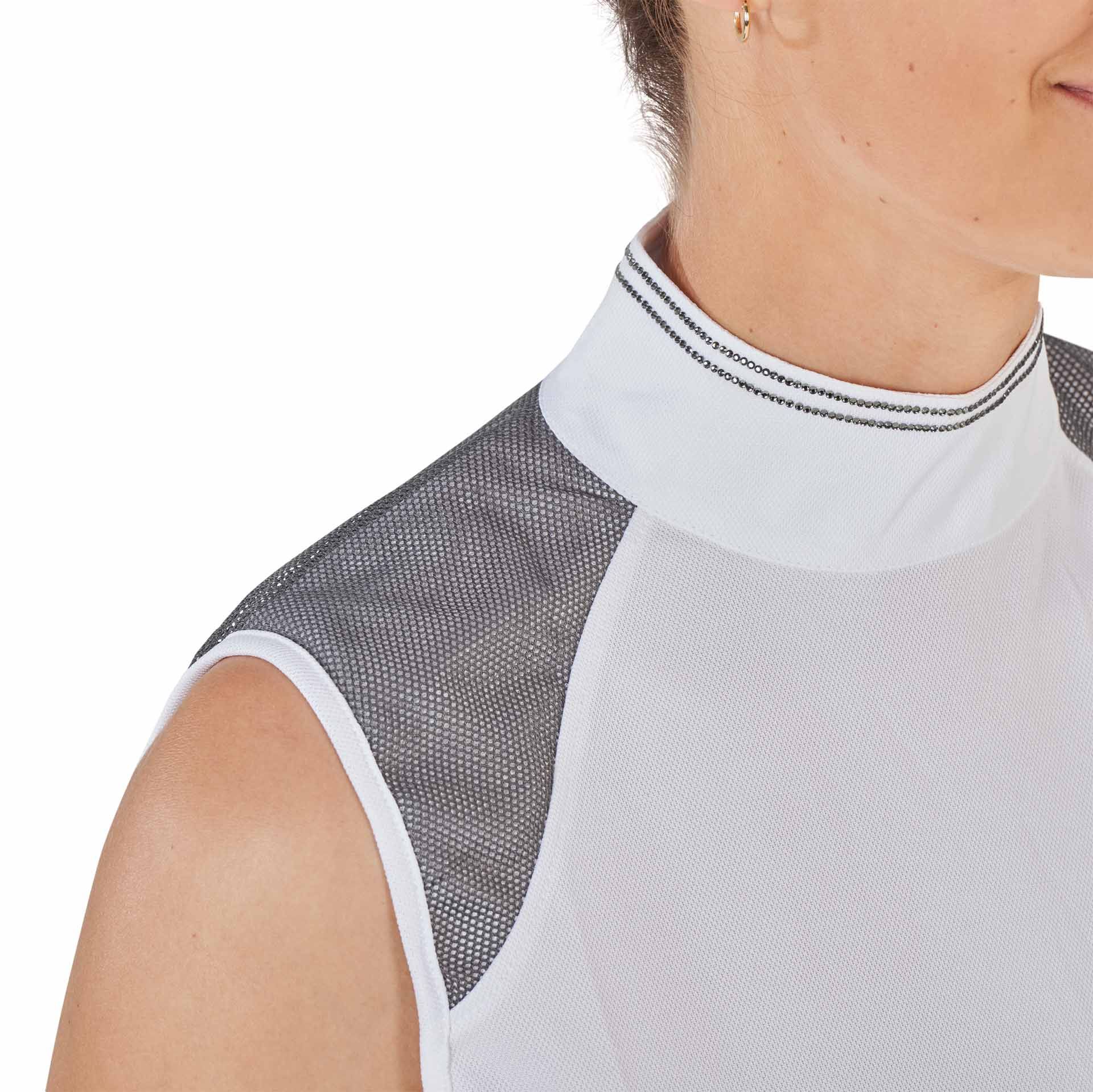 Découvrez le T-shirt de concours BUSSE SALEA, sans manches, un vêtement sportif avec une décoration élégante en strass sur le col. Avec son col montant fermé à l'arrière par des boutons-pression incrustés de strass, ce t-shirt se distingue par son style unique.