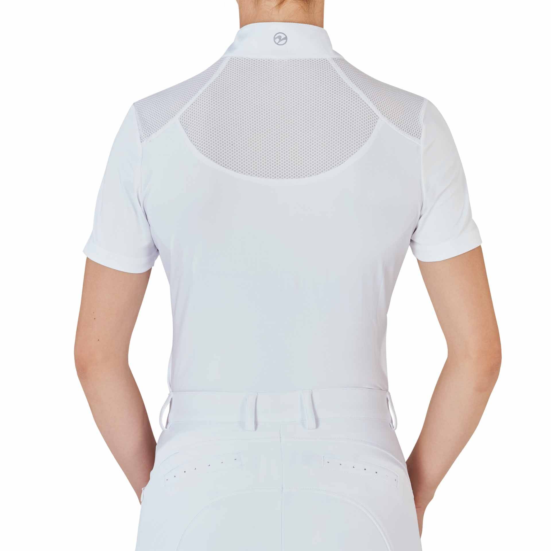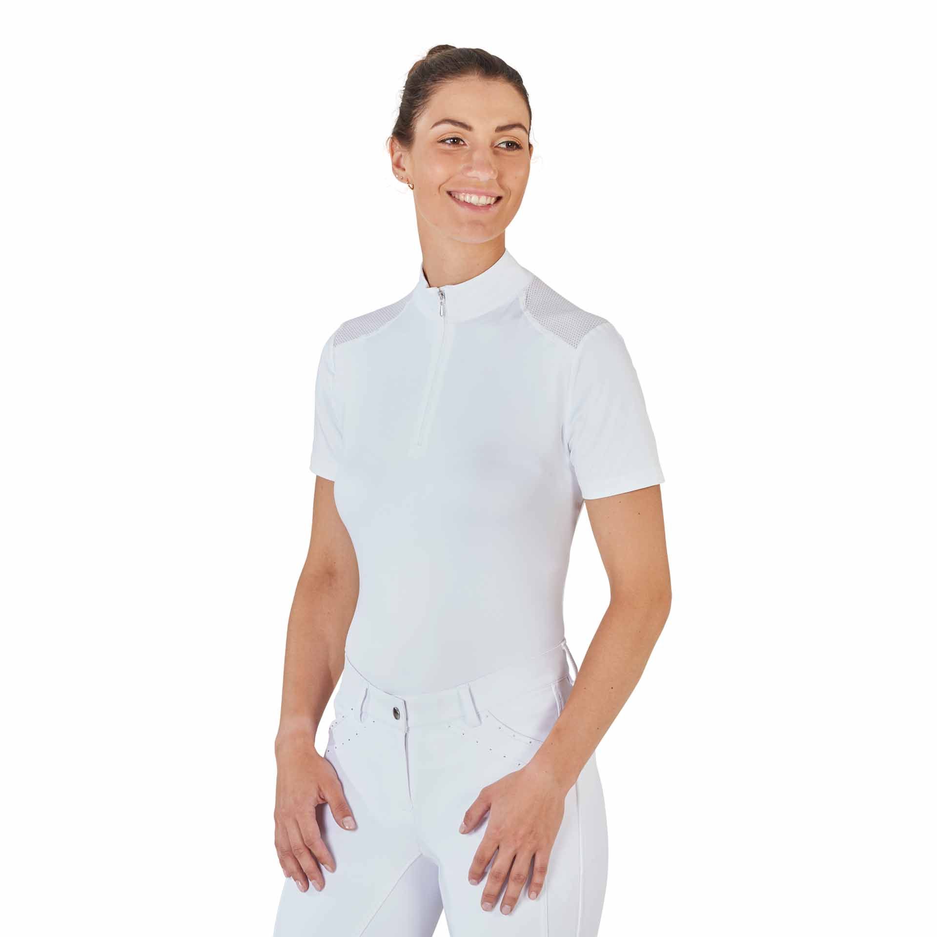 Présentation du T-shirt de concours BUSSE ZAMORA, sans manches, un vêtement sportif élégant doté de panneaux en mesh respirant. Avec son col montant fermé à l'avant par une fermeture éclair, ce t-shirt est idéal pour les compétitions équestres.