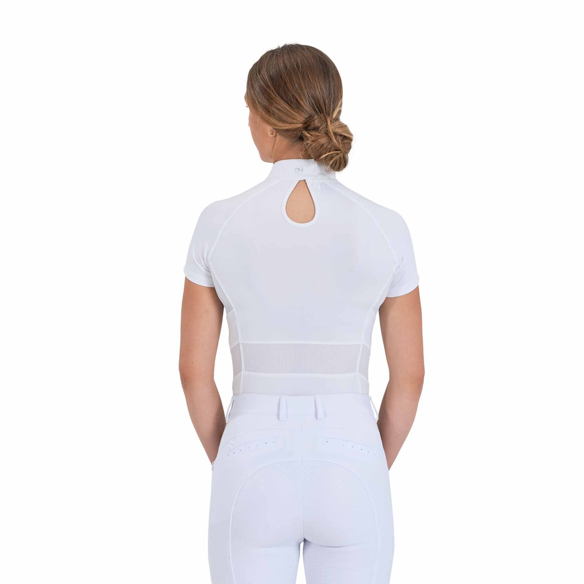 Laissez-nous vous présenter le T-shirt de concours BUSSE FEBARA, une création sportive et discrète avec des détails féminins qui enrichissent son design. Avec son col montant et sa petite ouverture goutte à l'arrière, fermée par des boutons-pression, ce T-shirt dégage une allure élégante et assumée.