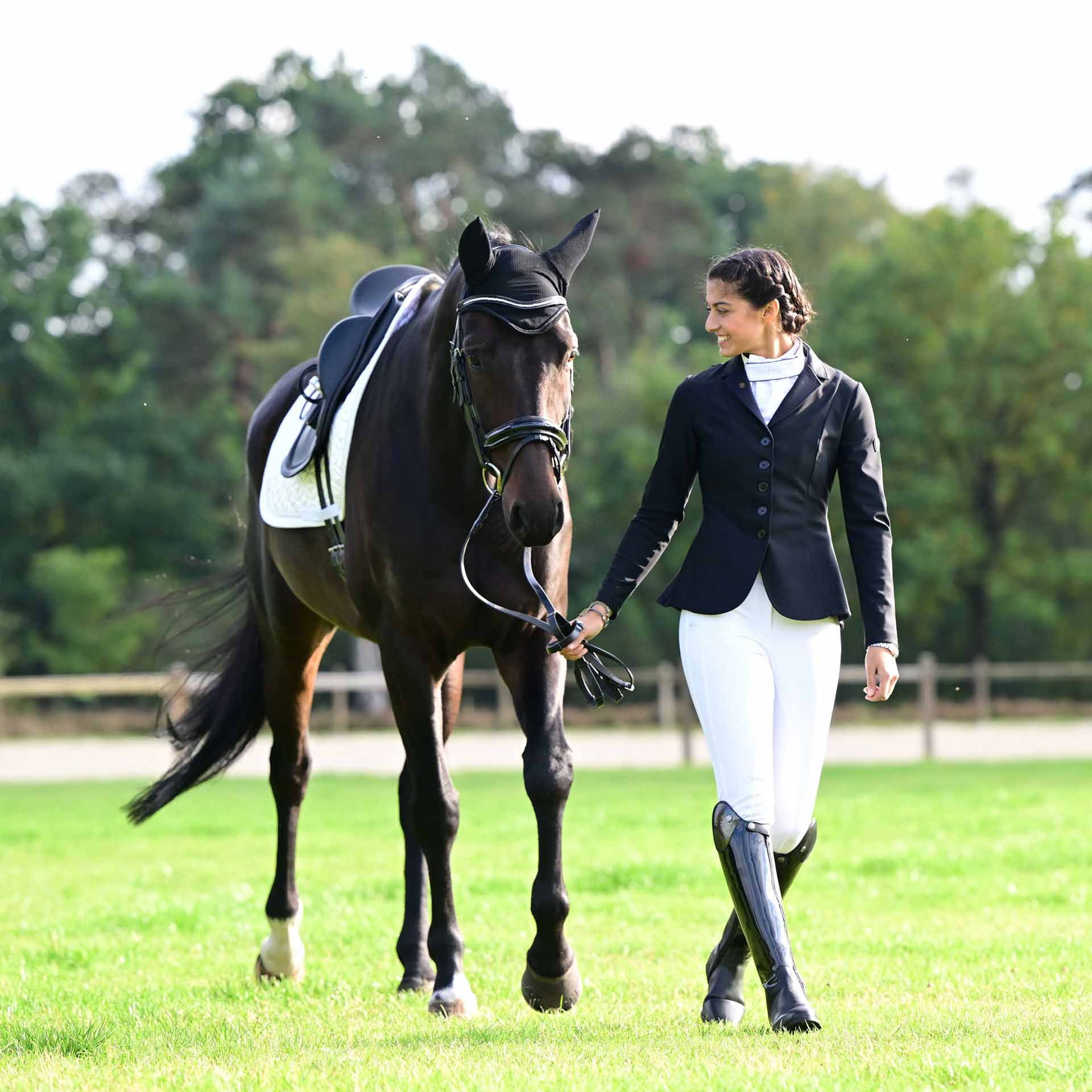 Réponse : La veste de concours BUSSE NEAPEL se démarque par son mélange de technologie moderne et de détails féminins. Elle comprend des caractéristiques uniques telles que cinq boutons simples, un galon en satin sur le col à revers et le bandeau arrière, et un tissu fonctionnel 4-way stretch.