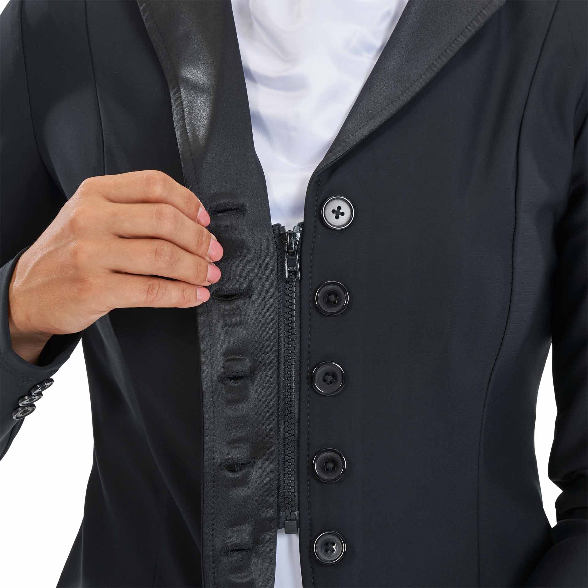 Cette veste de concours offre un ajustement parfait grâce à sa coupe cintrée et son zip YKK® sous la patte de boutonnage, garantissant une position optimale en selle. Le matériau fonctionnel 4-way stretch à deux couches assure un excellent confort, est respirant, résistant et facile d'entretien. Séchant rapidement et lavable en machine, cette veste est parfaite pour toutes vos compétitions équestres.