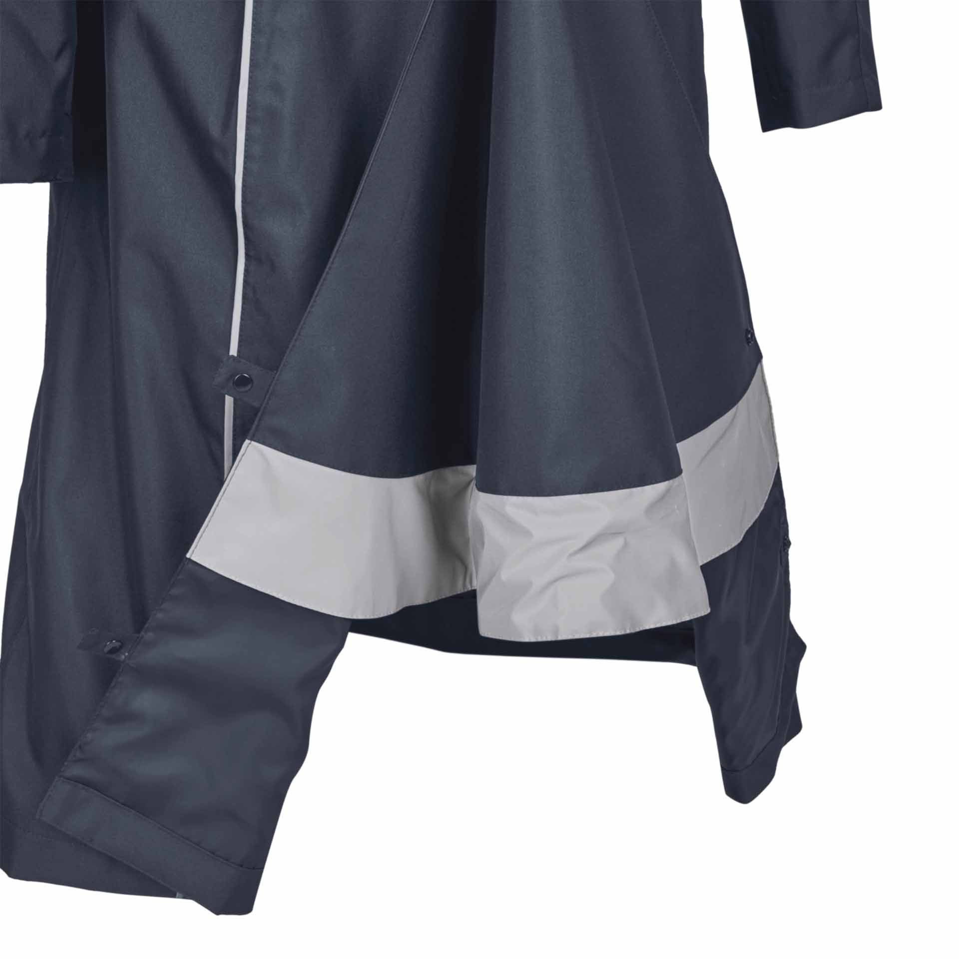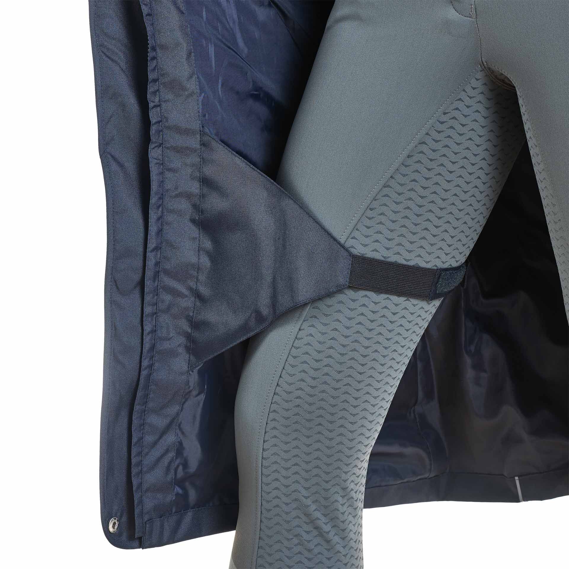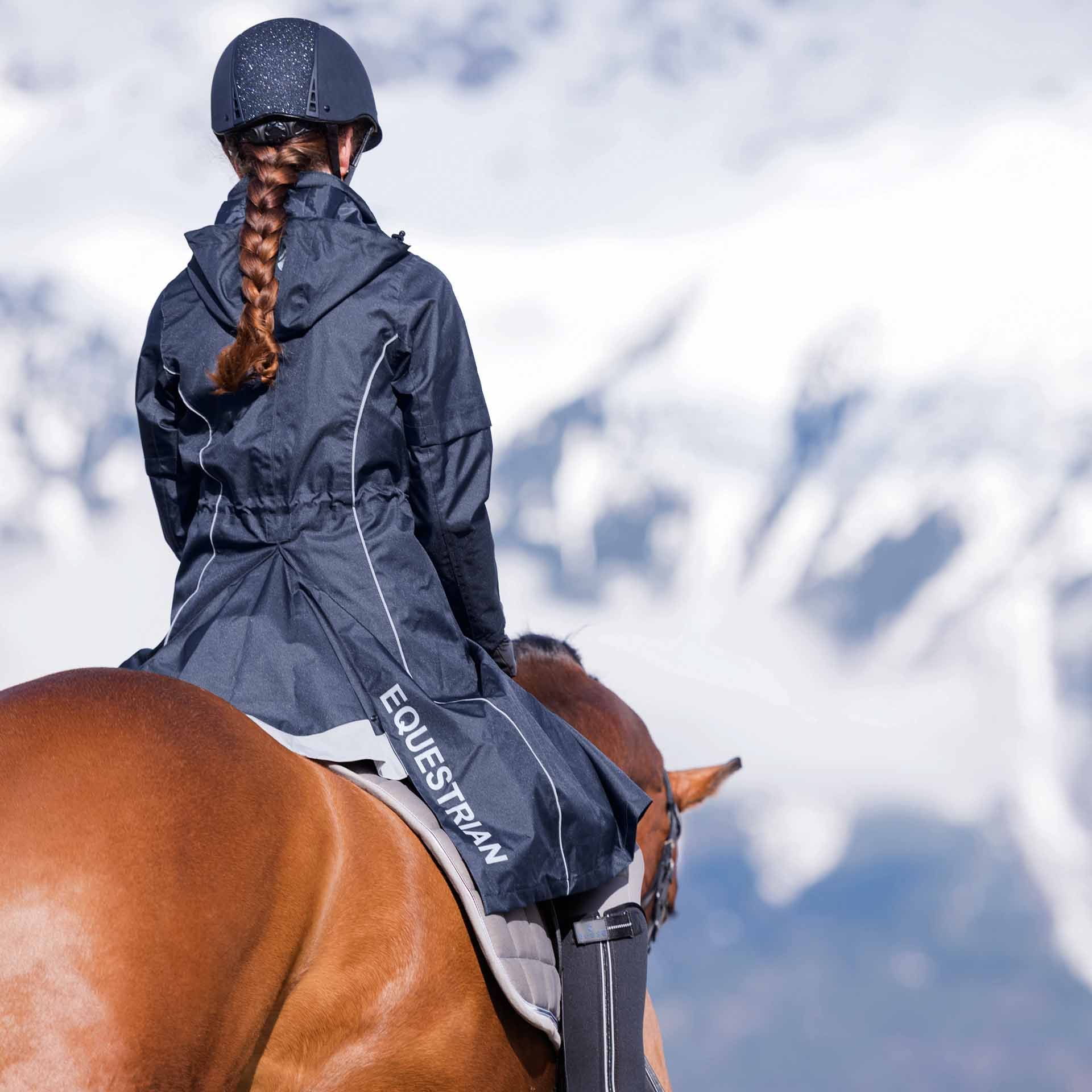 Le manteau dispose de nombreuses fonctionnalités intelligentes, notamment une fente d'équitation longue avec un matériau réfléchissant qui protège votre selle et améliore votre visibilité. Les boucles de jambe élastiques maintiennent le manteau en place même en cas de vent. Les manches peuvent être retroussées pour révéler des détails réfléchissants supplémentaires pour une meilleure visibilité. De plus, la capuche réglable et amovible avec visière moulable peut être fixée à l'arrière pendant l'équitation.