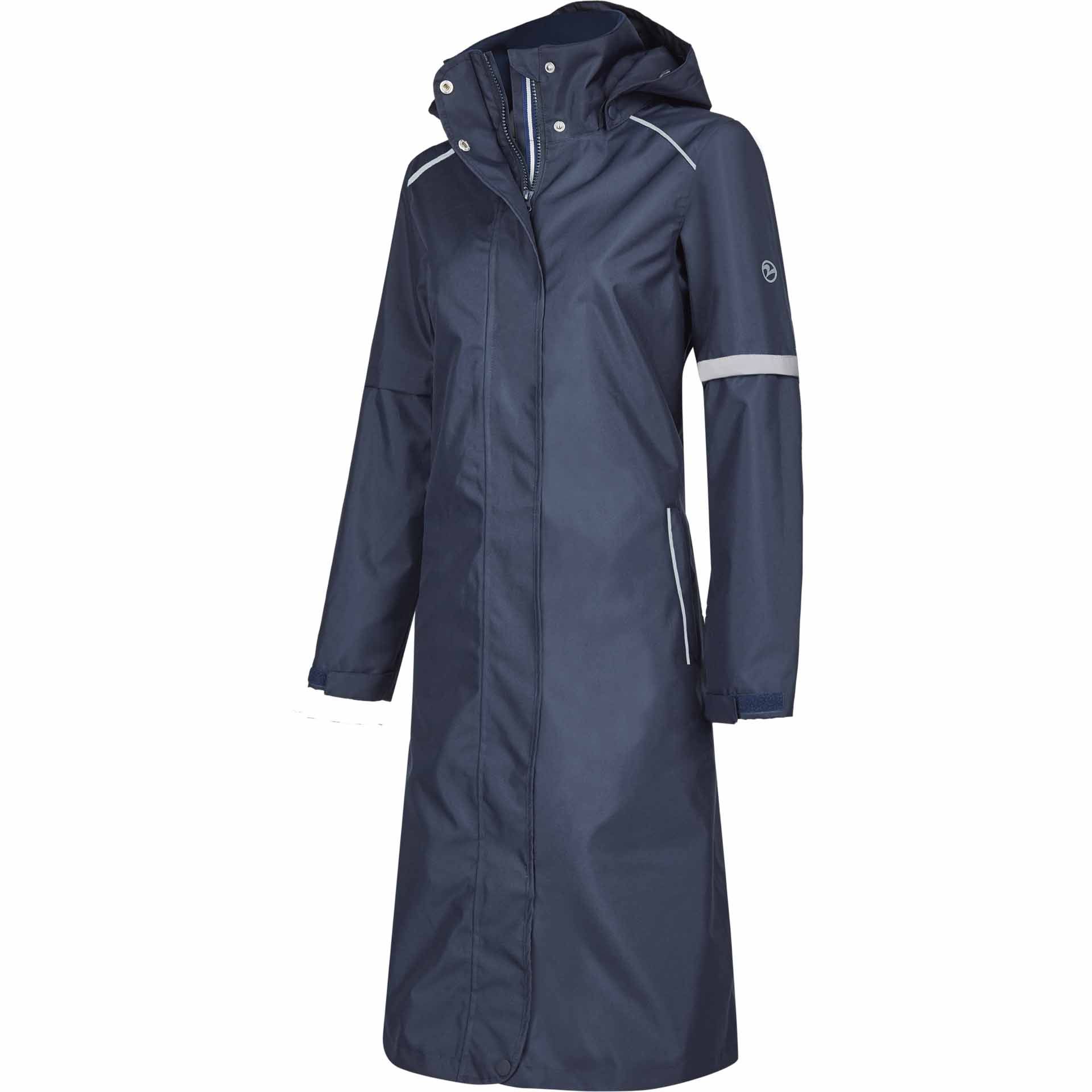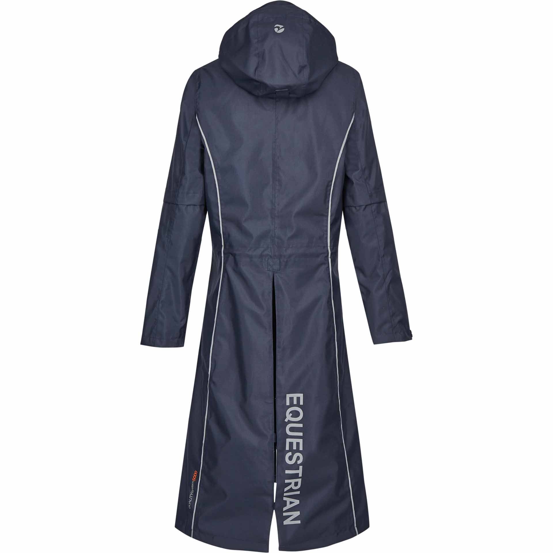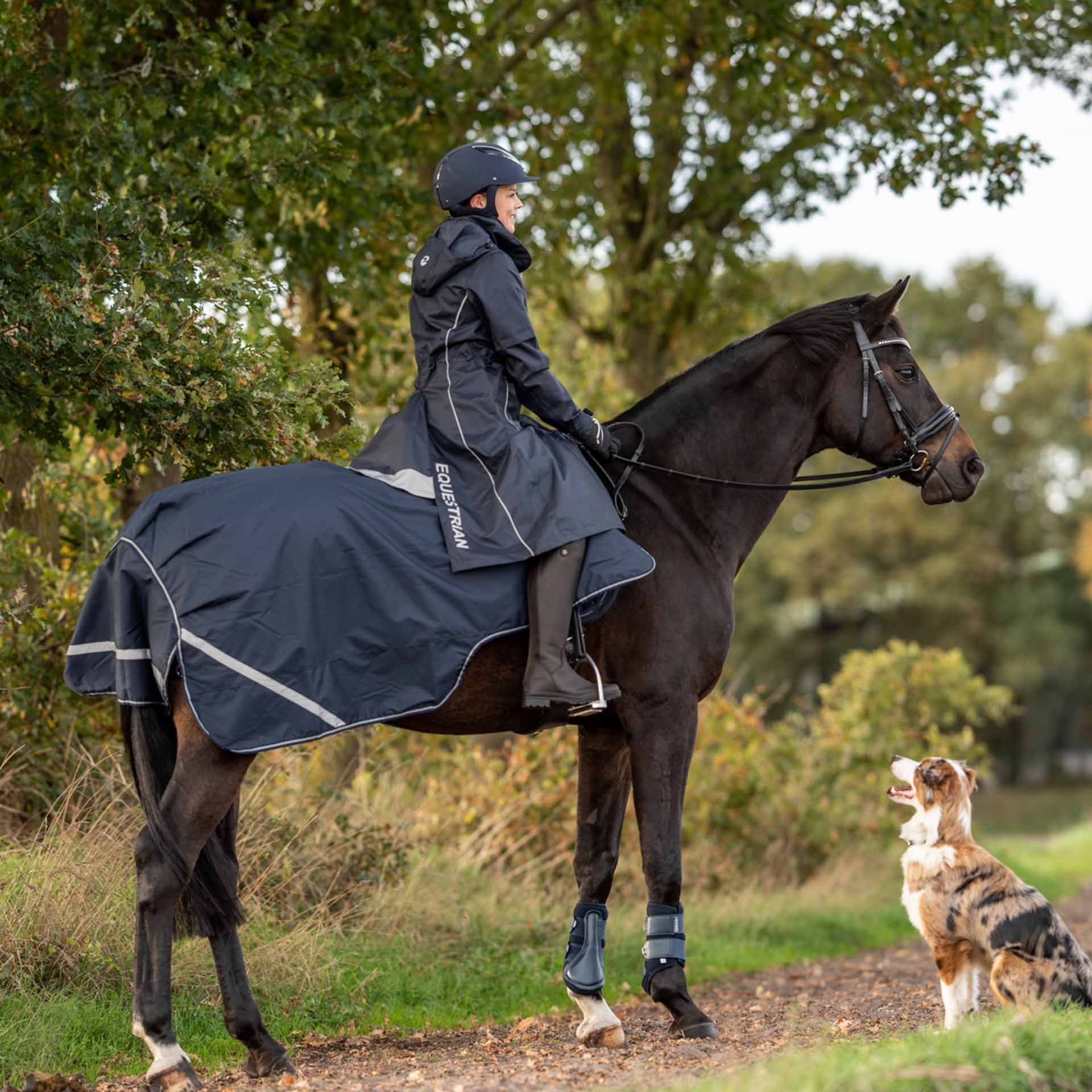 Le manteau dispose de nombreuses fonctionnalités intelligentes, notamment une fente d'équitation longue avec un matériau réfléchissant qui protège votre selle et améliore votre visibilité. Les boucles de jambe élastiques maintiennent le manteau en place même en cas de vent. Les manches peuvent être retroussées pour révéler des détails réfléchissants supplémentaires pour une meilleure visibilité. De plus, la capuche réglable et amovible avec visière moulable peut être fixée à l'arrière pendant l'équitation.