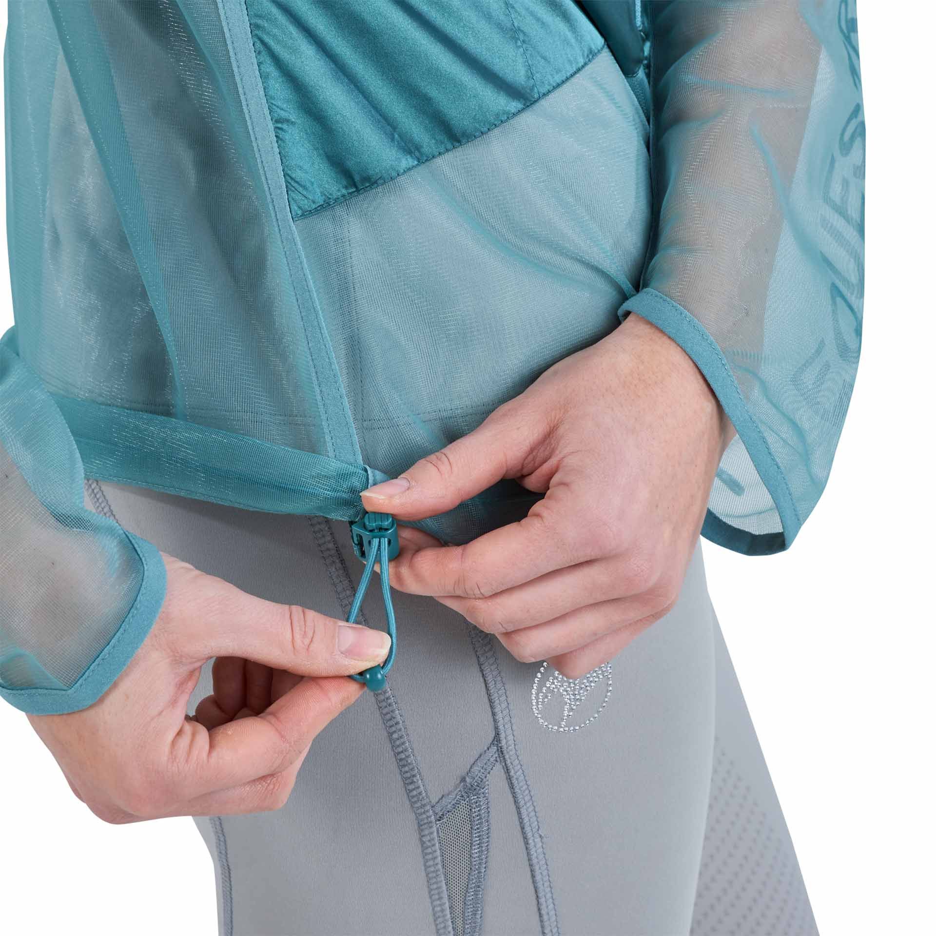 La veste offre de nombreuses fonctionnalités spécialement conçues pour les cavalières : un zip principal à double sens avec protection de selle pour préserver le cuir, une capuche réglable qui peut offrir une protection partielle du visage si nécessaire et deux poches zippées spacieuses qui offrent suffisamment d'espace de rangement pour le smartphone et les petits objets susceptibles d'être perdus. Les poignets sont munis de manchons Lycra® légèrement élastiques, et un cordon de serrage élastique dans la région de la taille peut être ajusté individuellement selon les besoins, ce qui est parfait pour l'équitation.