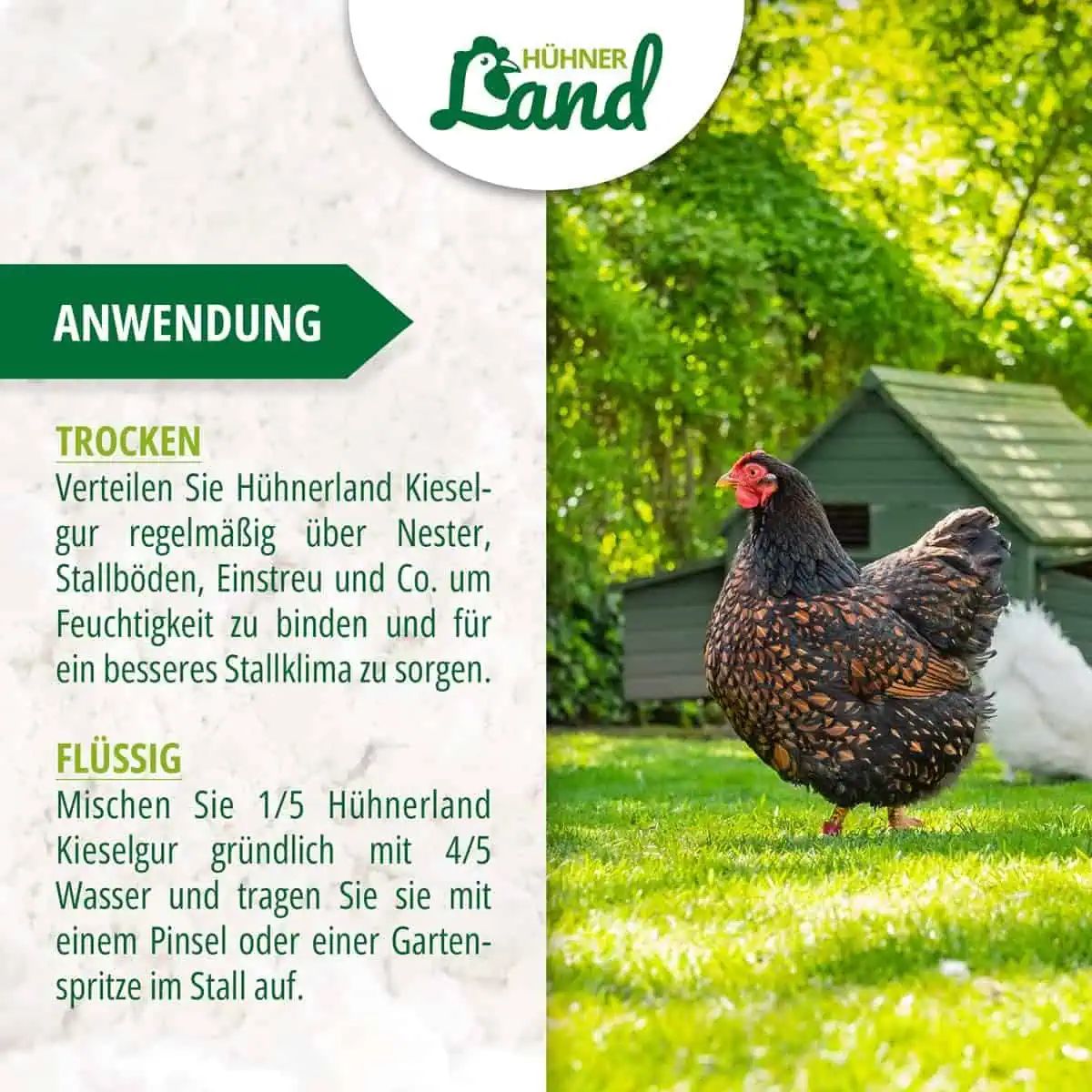 - Sec : Étalez régulièrement la terre de diatomées sur les nids, les sols d’écurie, la litière, etc. pour retenir l’humidité et assurer un meilleur climat d’écurie.