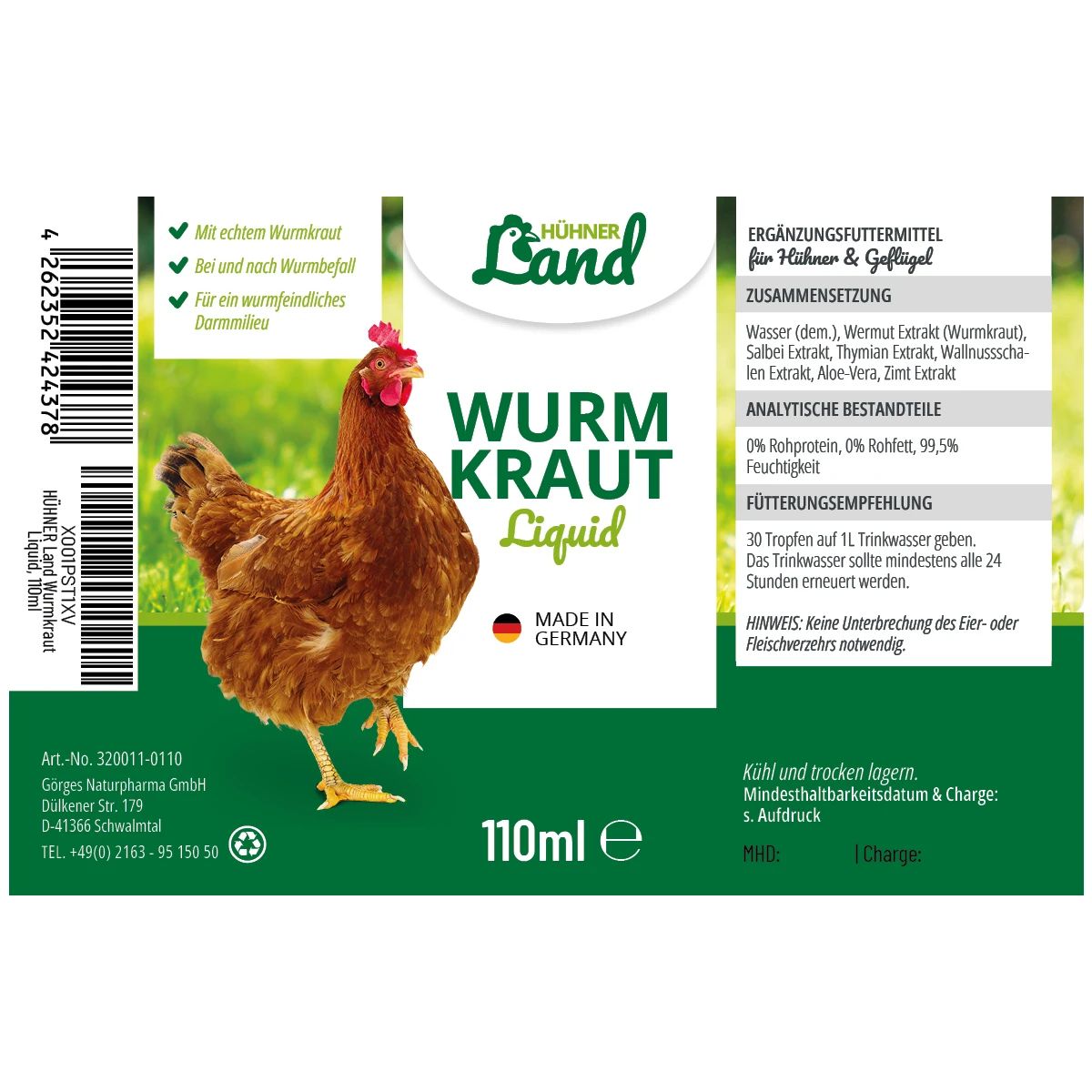 Le vermifuge liquide Wurmkraut offre un soutien naturel pour la santé de vos poules. Enrichi en véritable Wurmkraut, ainsi qu'en extraits de sauge et de thym, il aide à répondre aux besoins nutritionnels accrus de votre volaille.