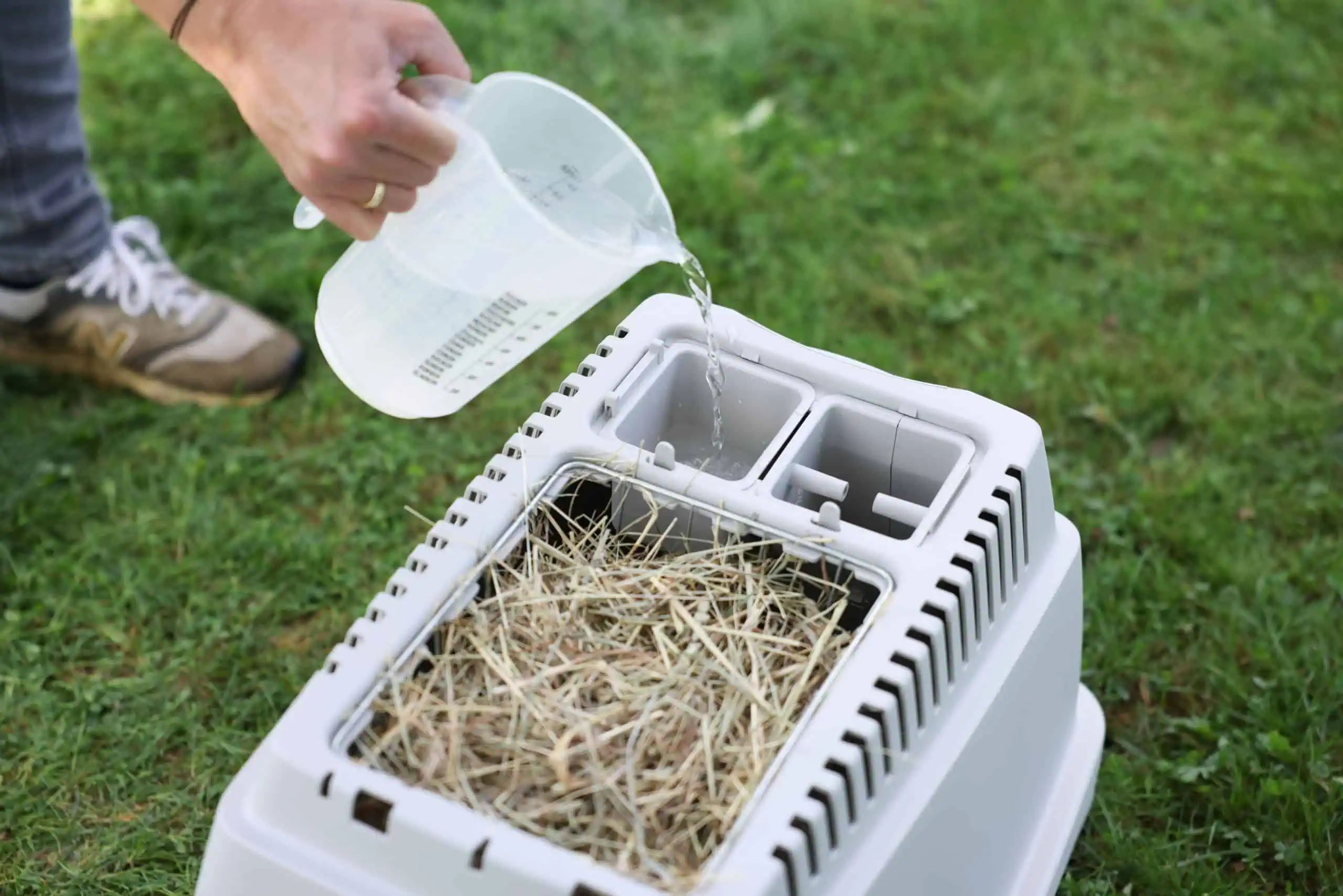 - Auge à foin intégrée, distributeurs d'eau et de nourriture