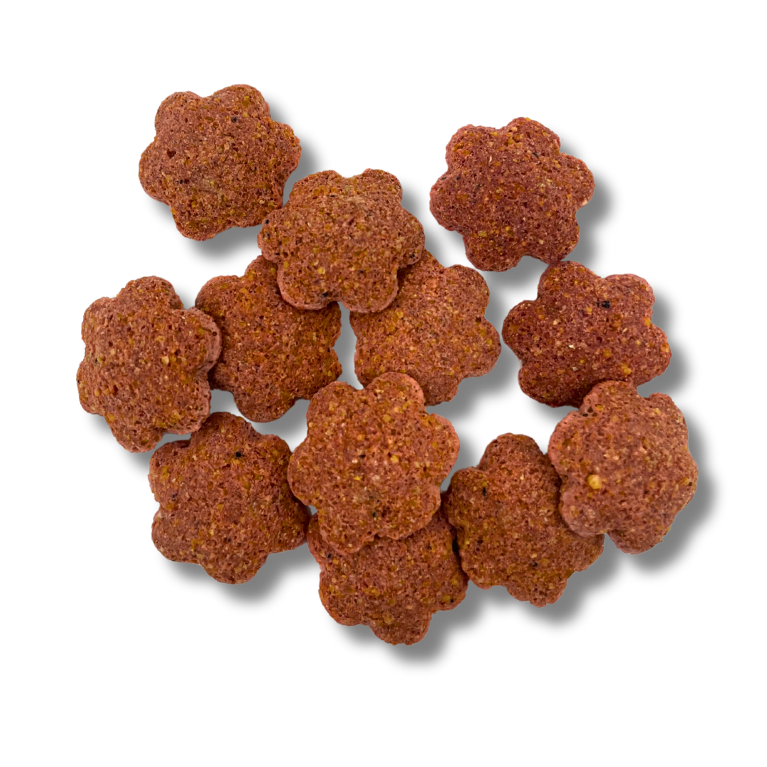 93,25 % maïs, 3,5 % huile de colza, 2 % poudre de betterave rouge, 1,25 % arômes naturels de fraise