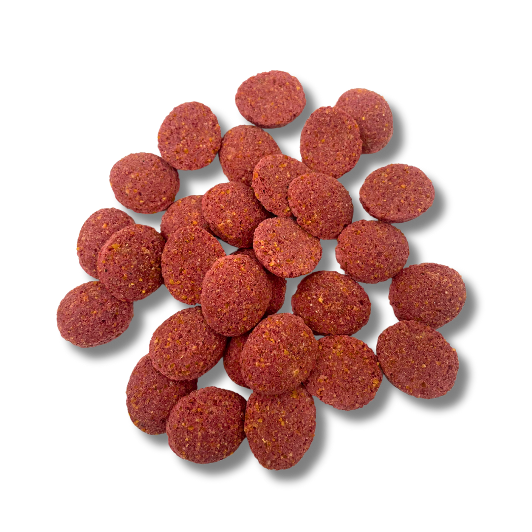 93,5 % maïs, 3,5 % huile de colza, 1 % cerises, 2 % poudre de betterave rouge