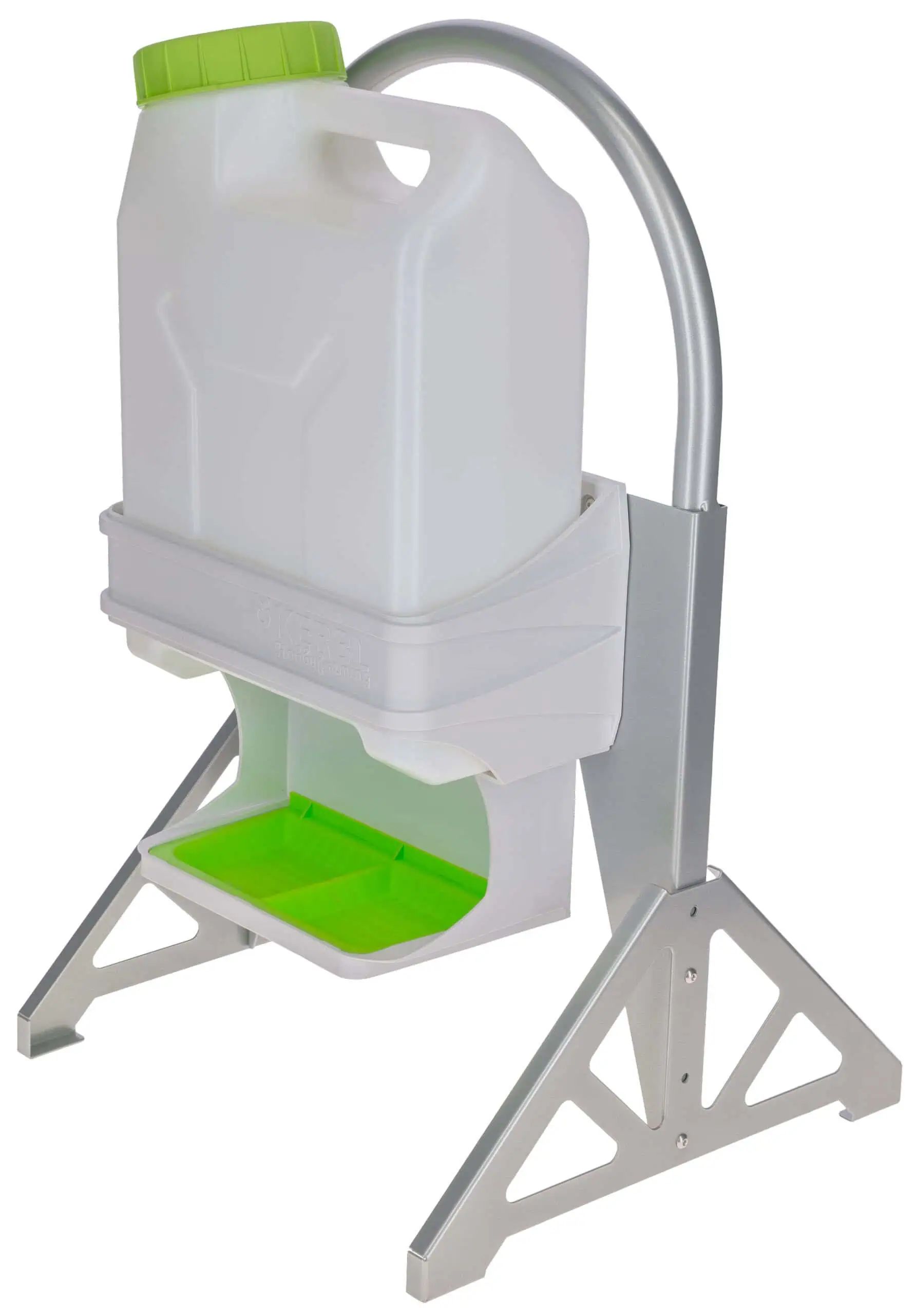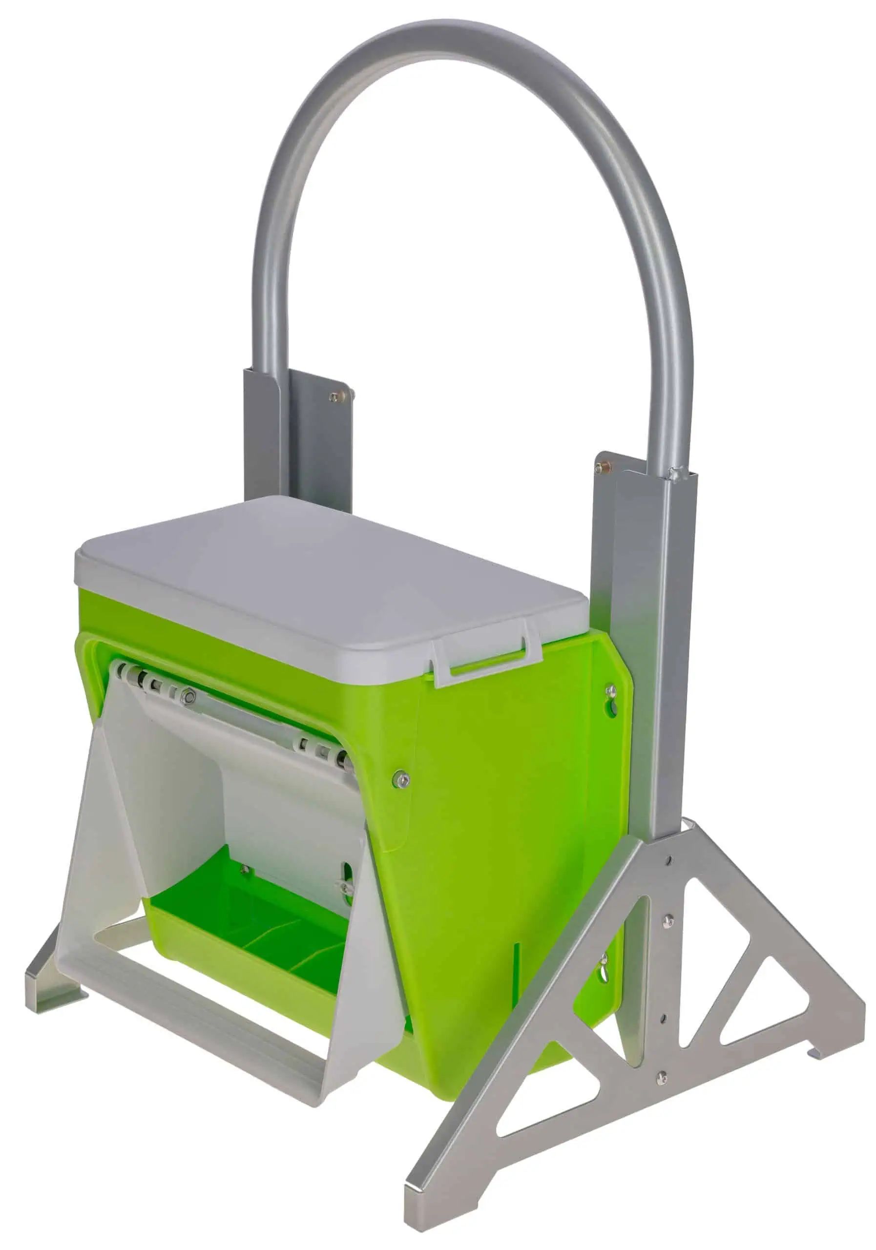 Le support mobile offre un soutien stable pour le système d'alimentation et de boisson, avec deux hauteurs réglables et un déplacement facile grâce à la forme de l'anse. Cela facilite la manipulation et le placement dans différentes zones de l'étable.