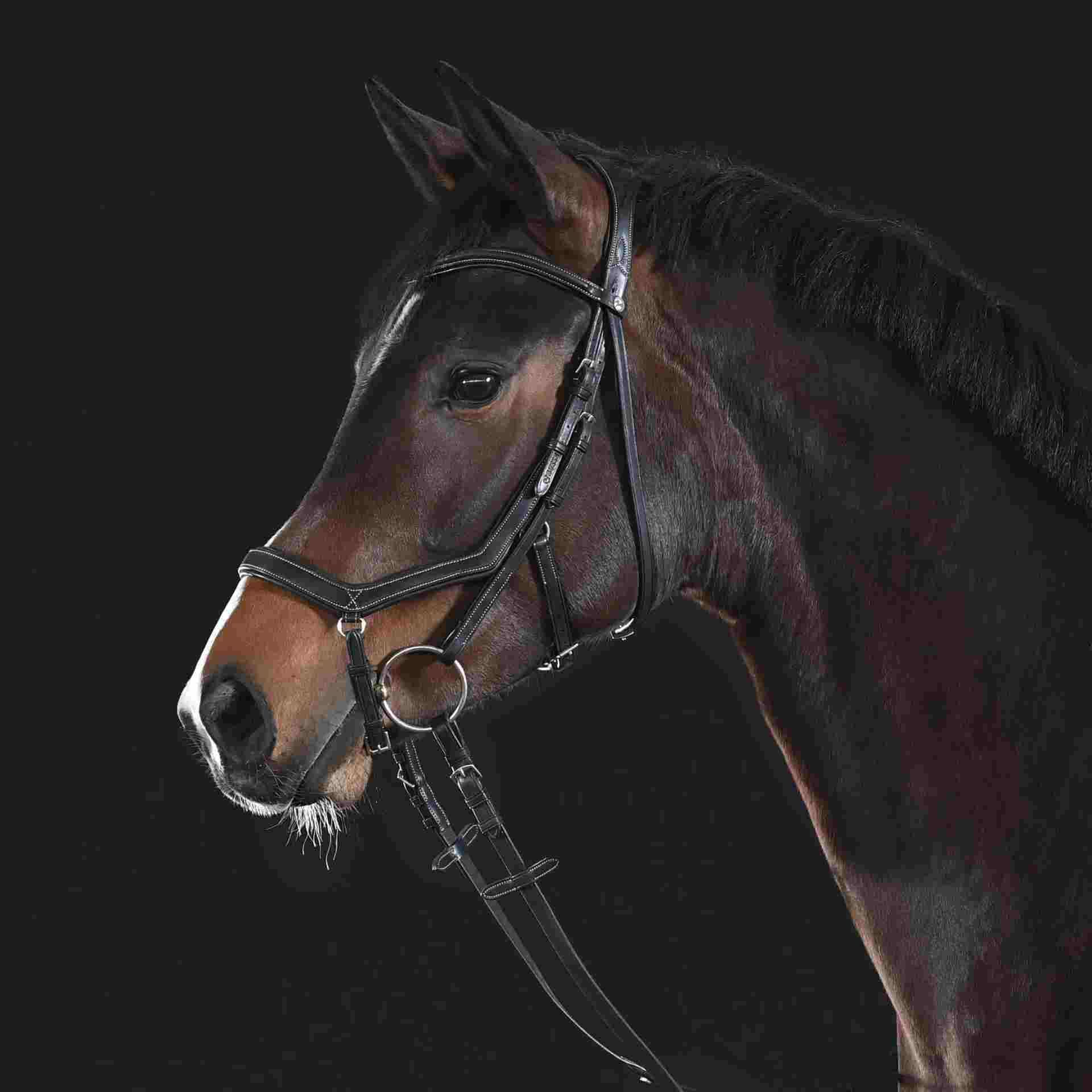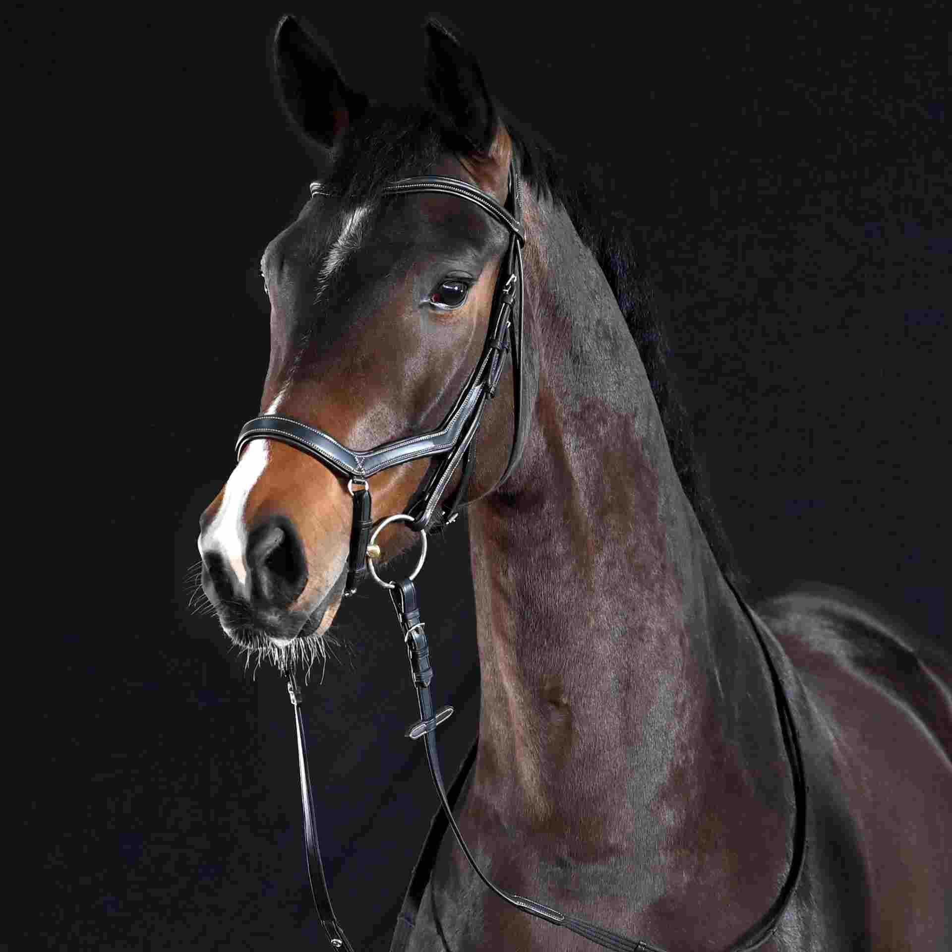 La coupe anatomique optimisée permet une action ciblée tout en restant douce. Les coutures contrastées ajoutent une touche de style intemporel et de sportivité. Le bridon offre une grande ajustabilité et permet de modifier l'angle pour une adaptation idéale à l'anatomie de la tête de chaque cheval. Un noseband court et rembourré minimise la pression sur les nerfs et les vaisseaux sanguins sensibles, tandis que la muserolle est positionnée de manière optimale pour éviter les points de pression et les frottements. Une têtière supplémentaire soulage les branches inférieures de la mâchoire et enserre délicatement et en toute sécurité la tête du cheval.