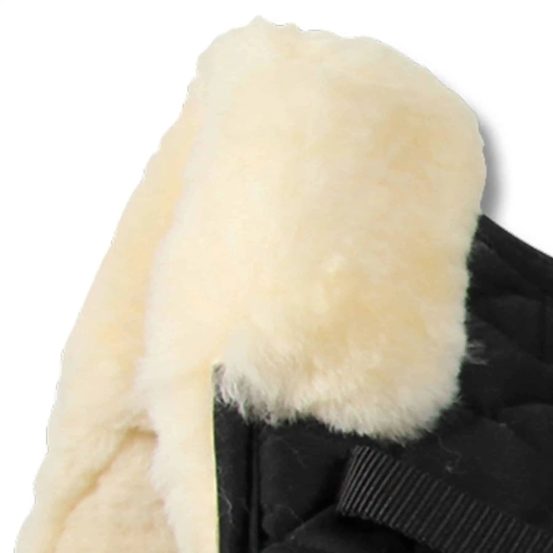Chabraque anatomique rembourrée en peau d’agneau au niveau de la selle et du garrot. La peau d’agneau assure une répartition optimale de la pression, une absorption rapide de la sueur et un bon équilibrage de la température sur le dos du cheval.
