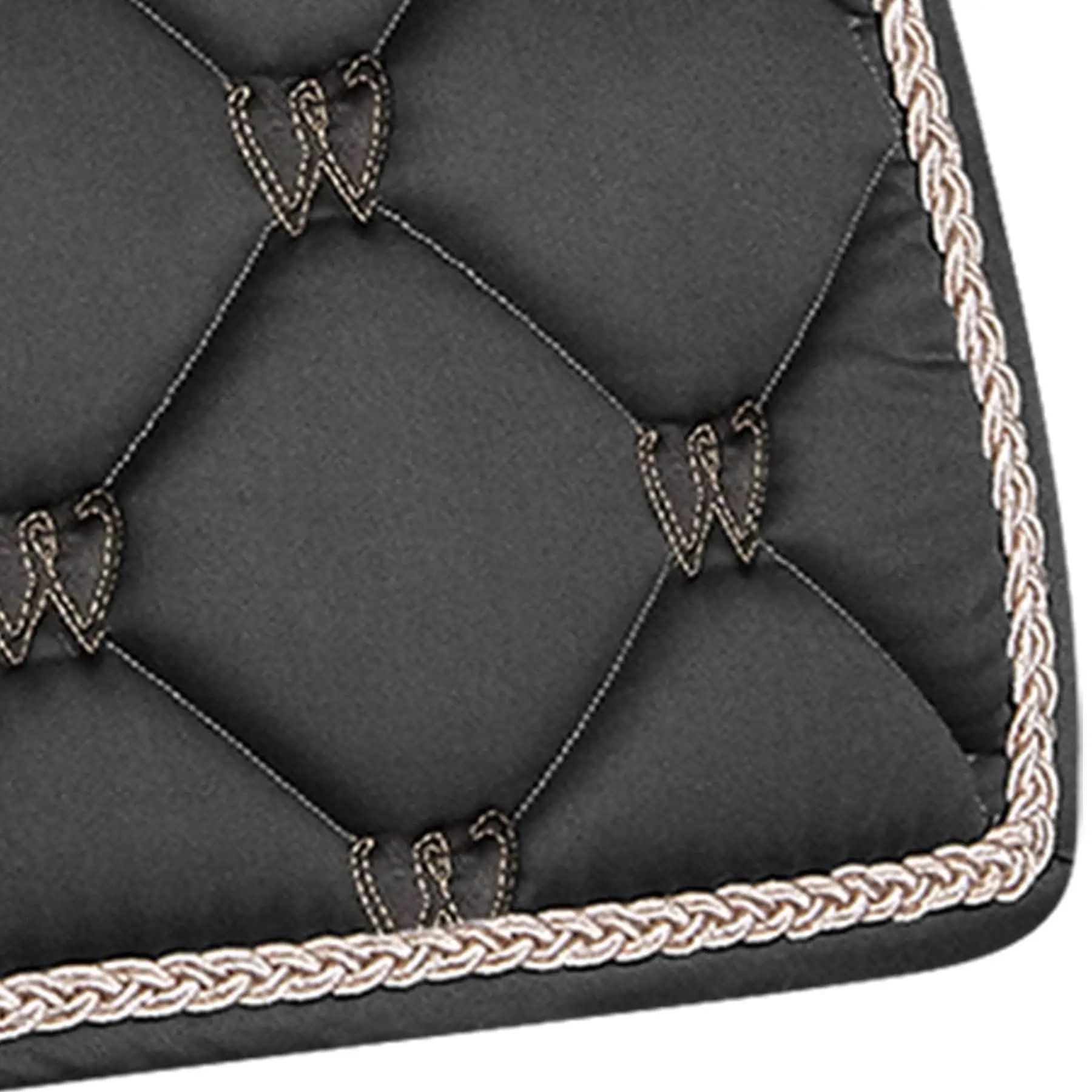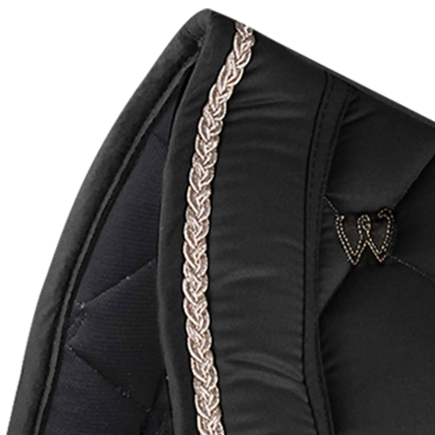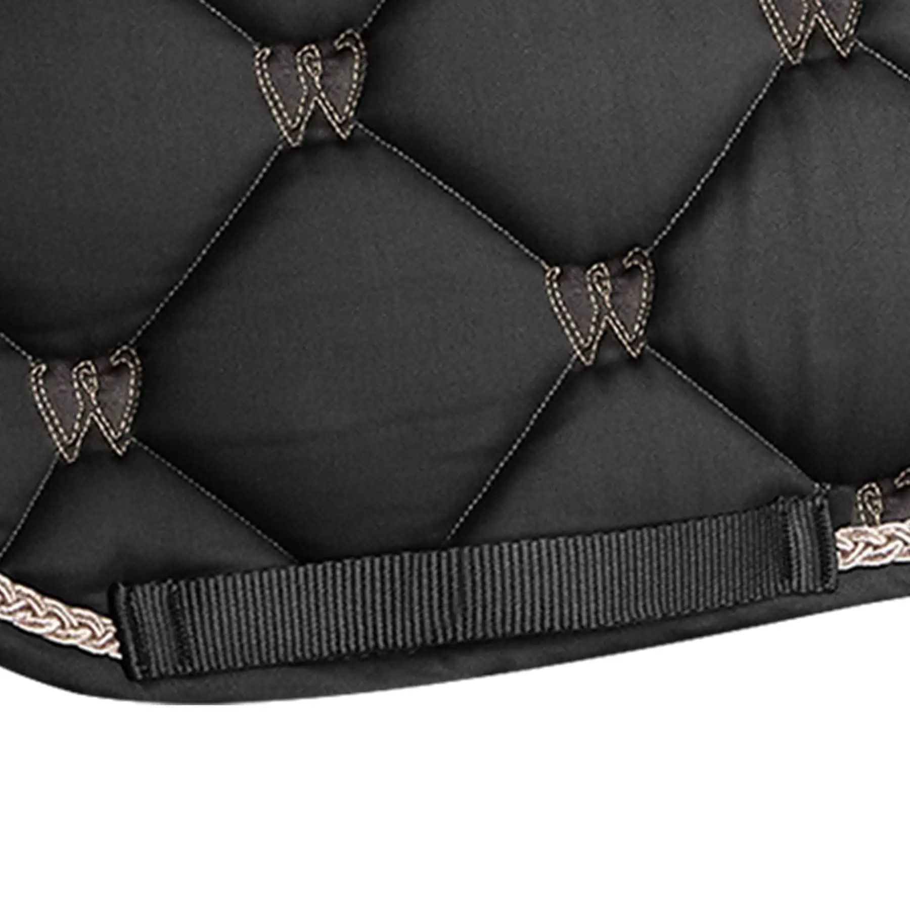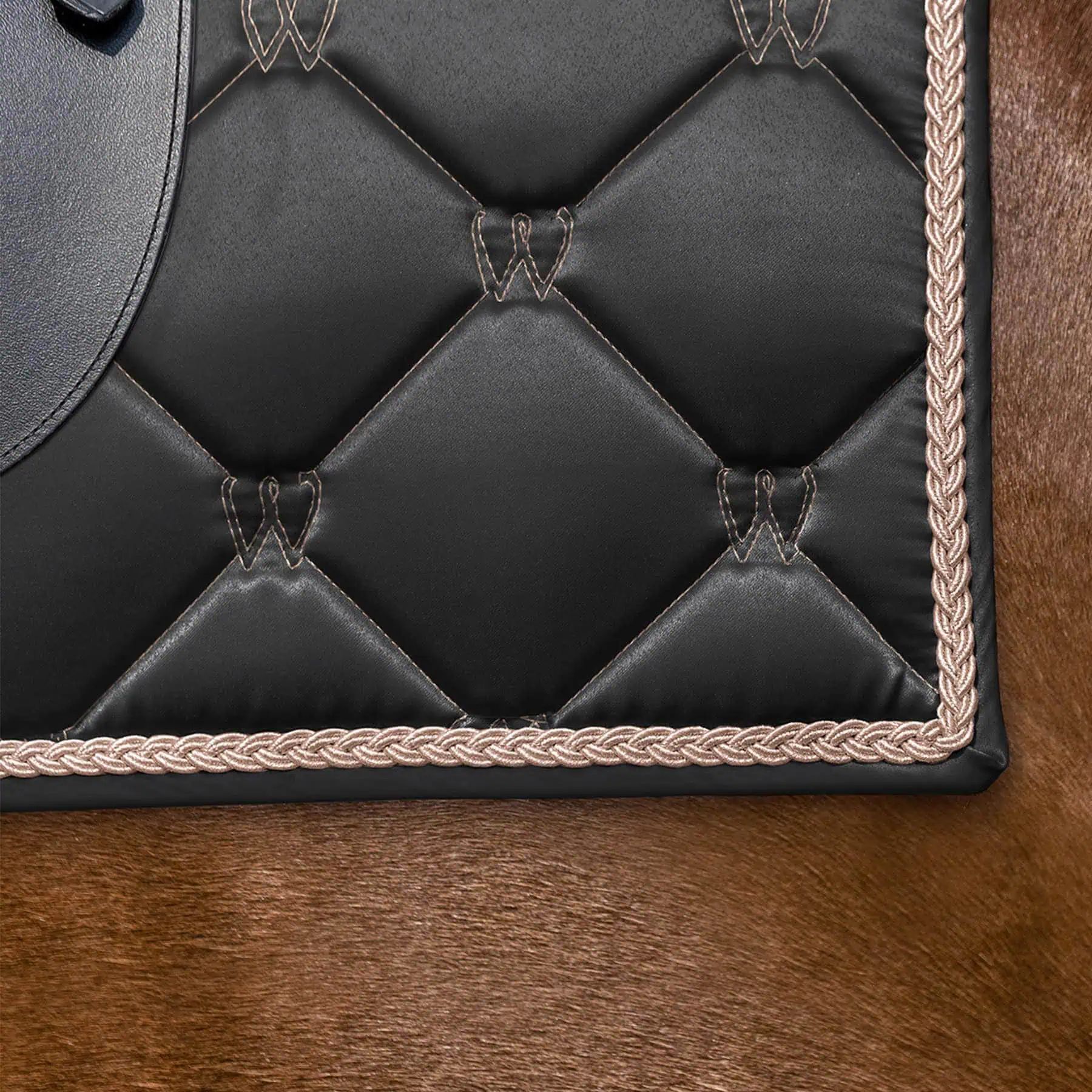Tapis de selle élégant d’excellente qualité, à l’aspect satiné. La face inférieure fonctionnelle assure une respiration optimale. Les 10 mm de mousse associés aux 200 g/m² de rembourrage assurent une répartition optimale de la pression.