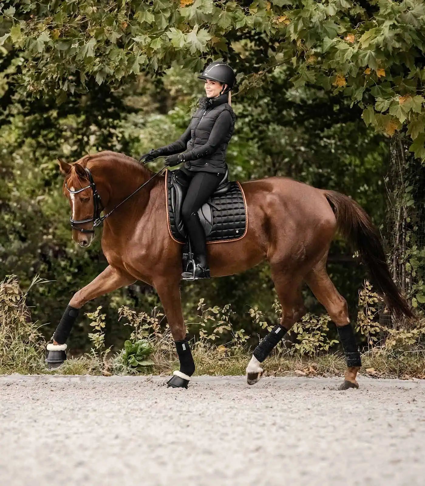 Chabraque classique taillée dans un beau tissu brillant. Les inserts en mesh placés le long du canal rachidien assurent une circulation permanente de l’air, évitant ainsi toute accumulation de chaleur. Deux cordons et la petite plaque métallique Waldhausen parachèvent cette chabraque.