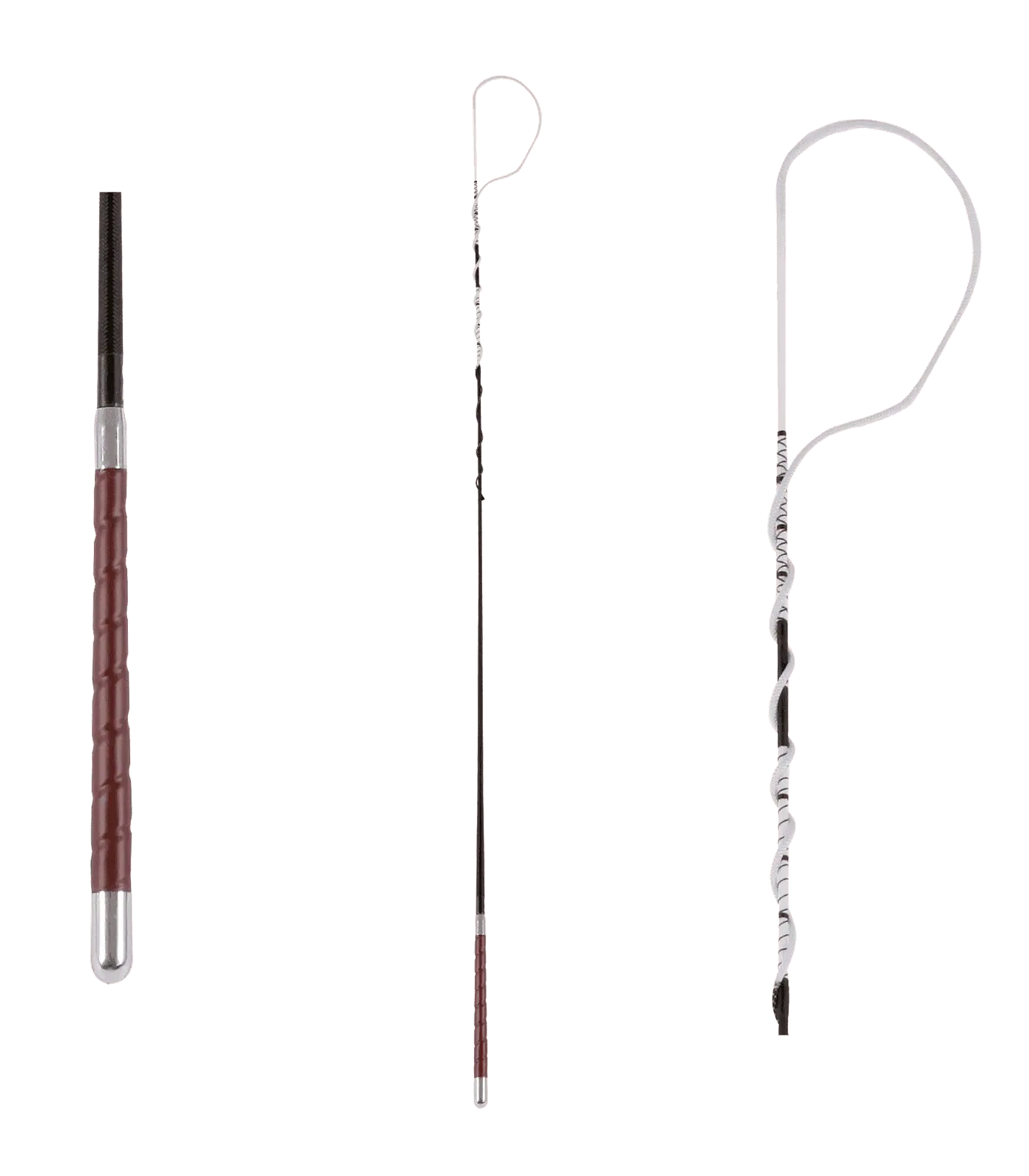Fouet d’attelage noir classique pourvu d’un manche en cuir brun aux extrémités argentées.