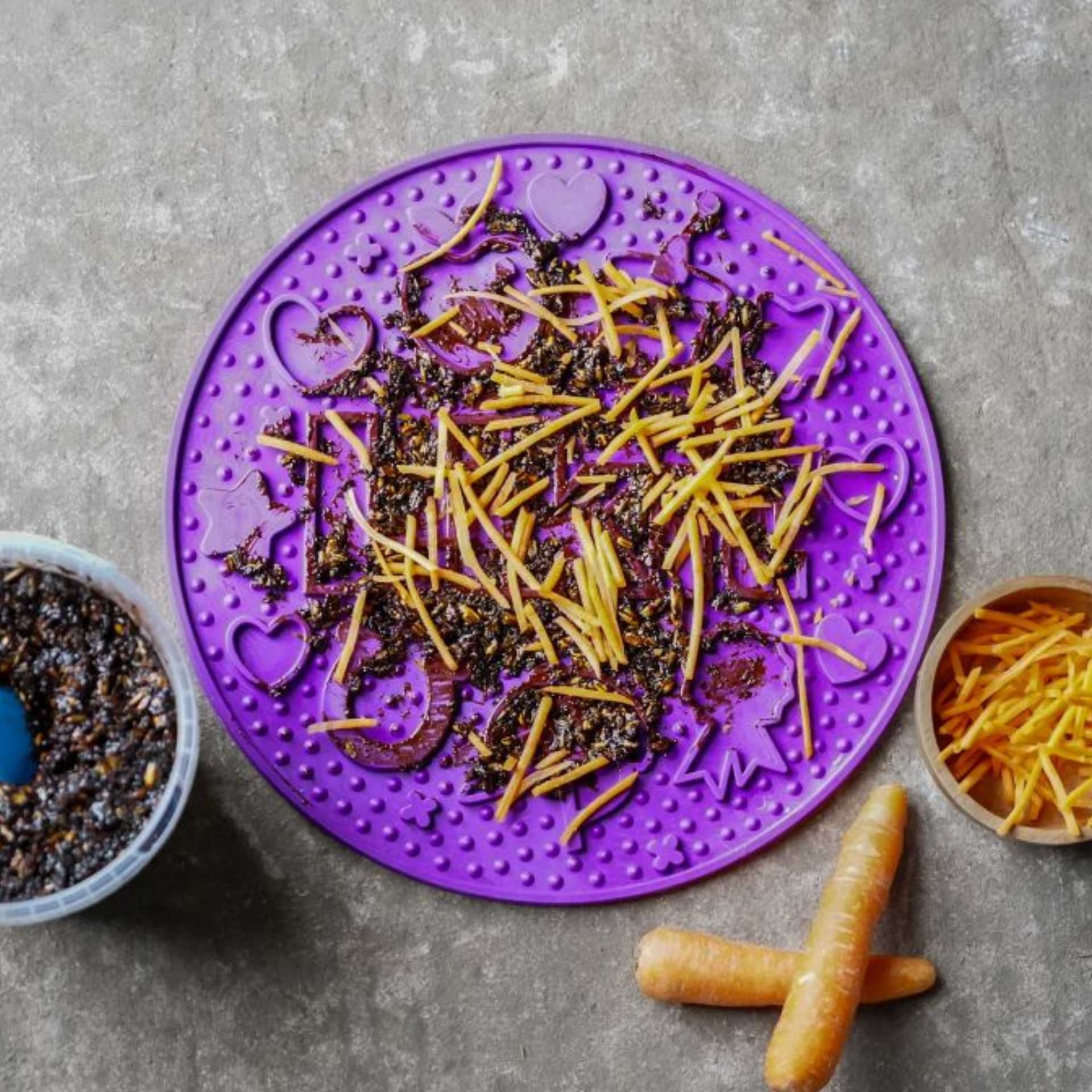 Il suffit de l’enduire avec la pâte Graze Paste ou le mélange Graze Mash de Likit avant d’y déposer, au choix, du fourrage, des carottes ou des friandises. Les recettes possibles sont infinies ! En alternative, il est également possible de placer le tapis au fond d’un seau de nourriture afin de ralentir l’ingestion de nourriture (slowfeeding).