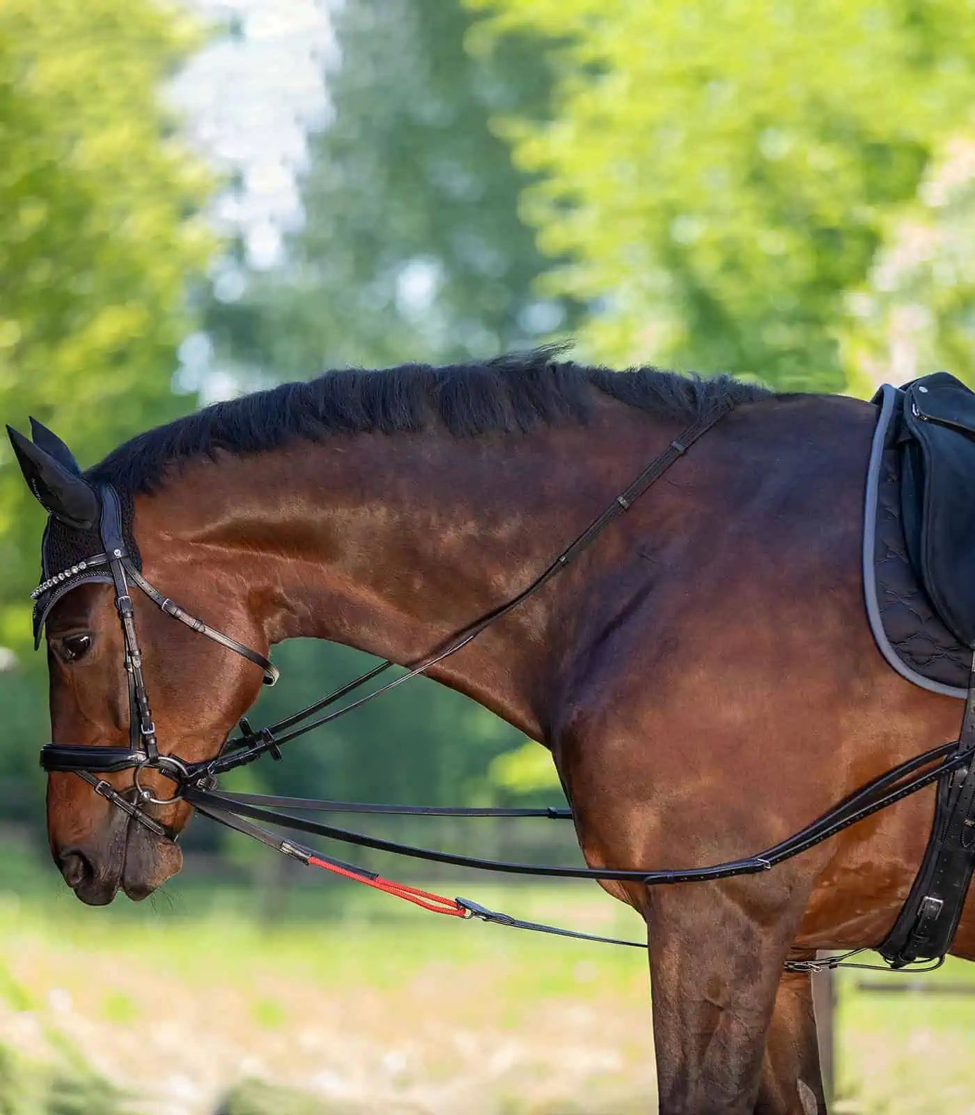 Rênes viennoises en cuir, flexibles et innovantes, longueur réglable, pour la monte et la longe. La rêne viennoise W-trainRein se fixe sur la sangle de selle ou le surfaix entre les pattes avant de l’animal. Une rêne spéciale passe par une poulie d’où elle retourne à la sangle de selle ou au surfaix en passant dans les deux cas par les anneaux du mors (de l’intérieur vers l’extérieur). La poulie permet de baisser la rêne, facilitant ainsi l’exercice musculaire et attribuant une courbure douce sans tirer sur la bouche lors d’une promenade ou du travail à la longe.