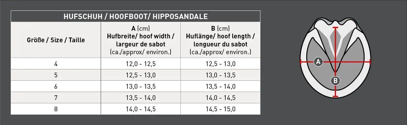 Tenue parfaite et enfilage facile grâce à une double fermeture autoagrippante. Ouvrir l’hipposandale à l’arrière, rabattre les pièces latérales sur le côté afin de l’enfiler facilement sur le sabot avant de la refermer. Le rembourrage moelleux sur le bord empêche les zones de frottement au niveau du boulet. Le renfort avant Waldhausen apporte une protection supplémentaire contre l’usure et les coups.
