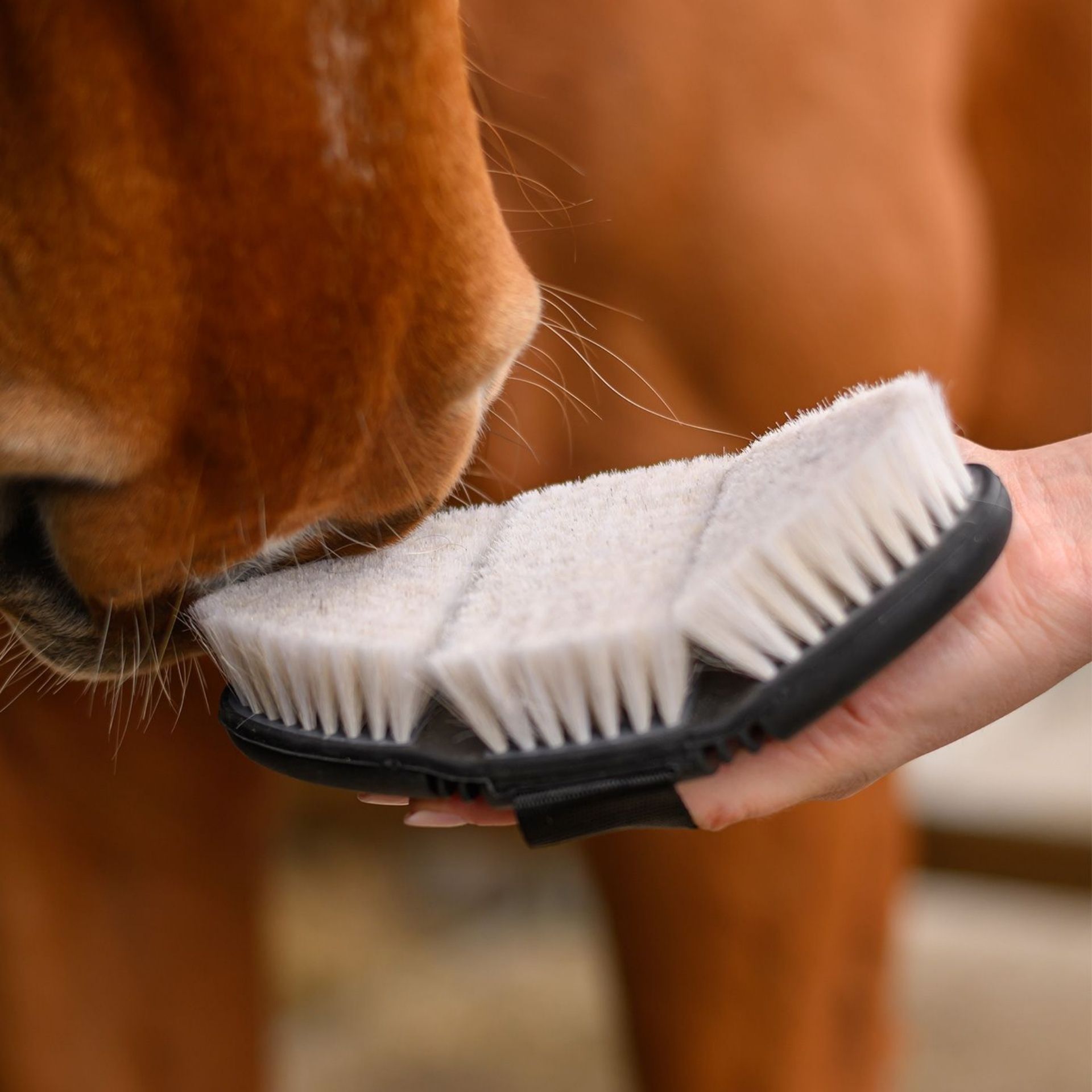 Pourvue de poils de chèvre extrêmement doux, la brosse à lustrer caresse l’animal et retire la poussière fine pour faire briller le poil en beauté.