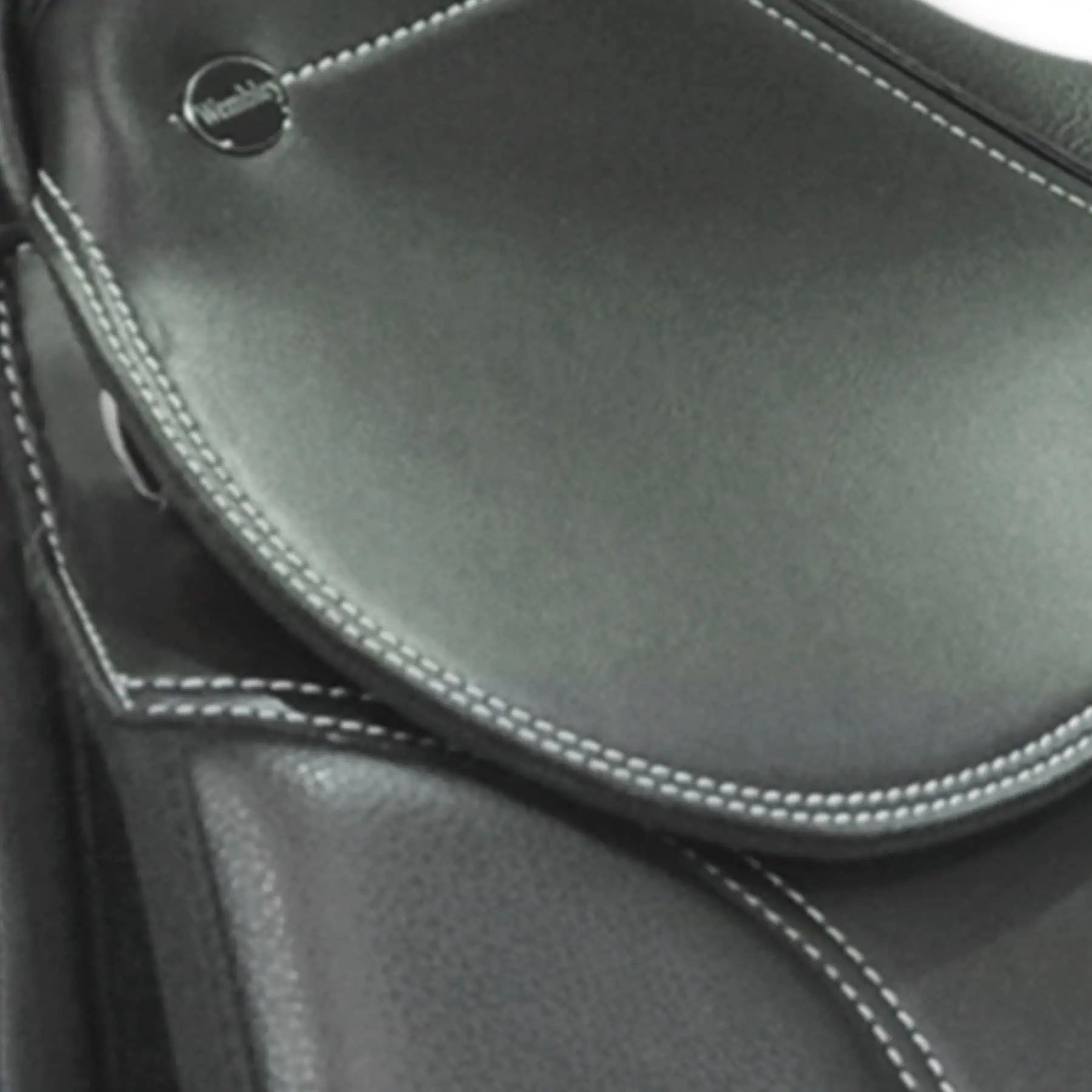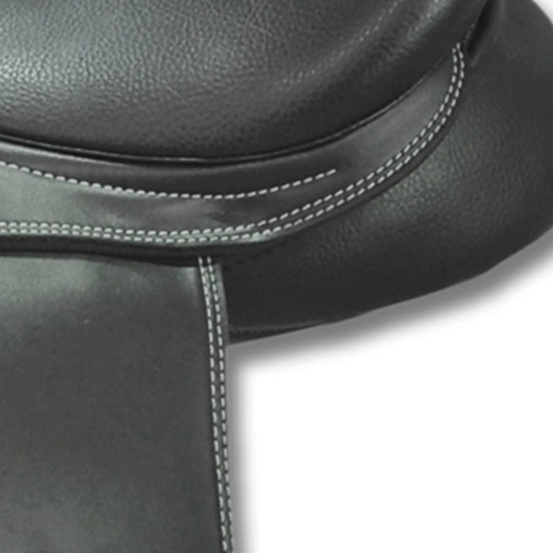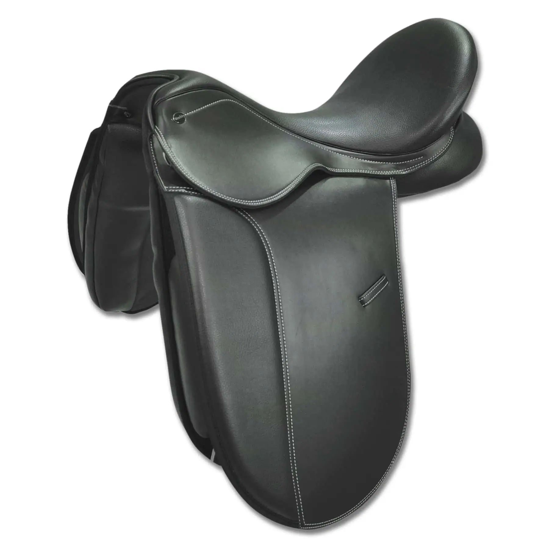 Selle de dressage Waldhausen en matières synthétiques faciles à nettoyer, équipée d’une arcade de garrot remplaçable, de taquets réglables et d’un sanglage en Y présentant un excellent rapport qualité-prix.