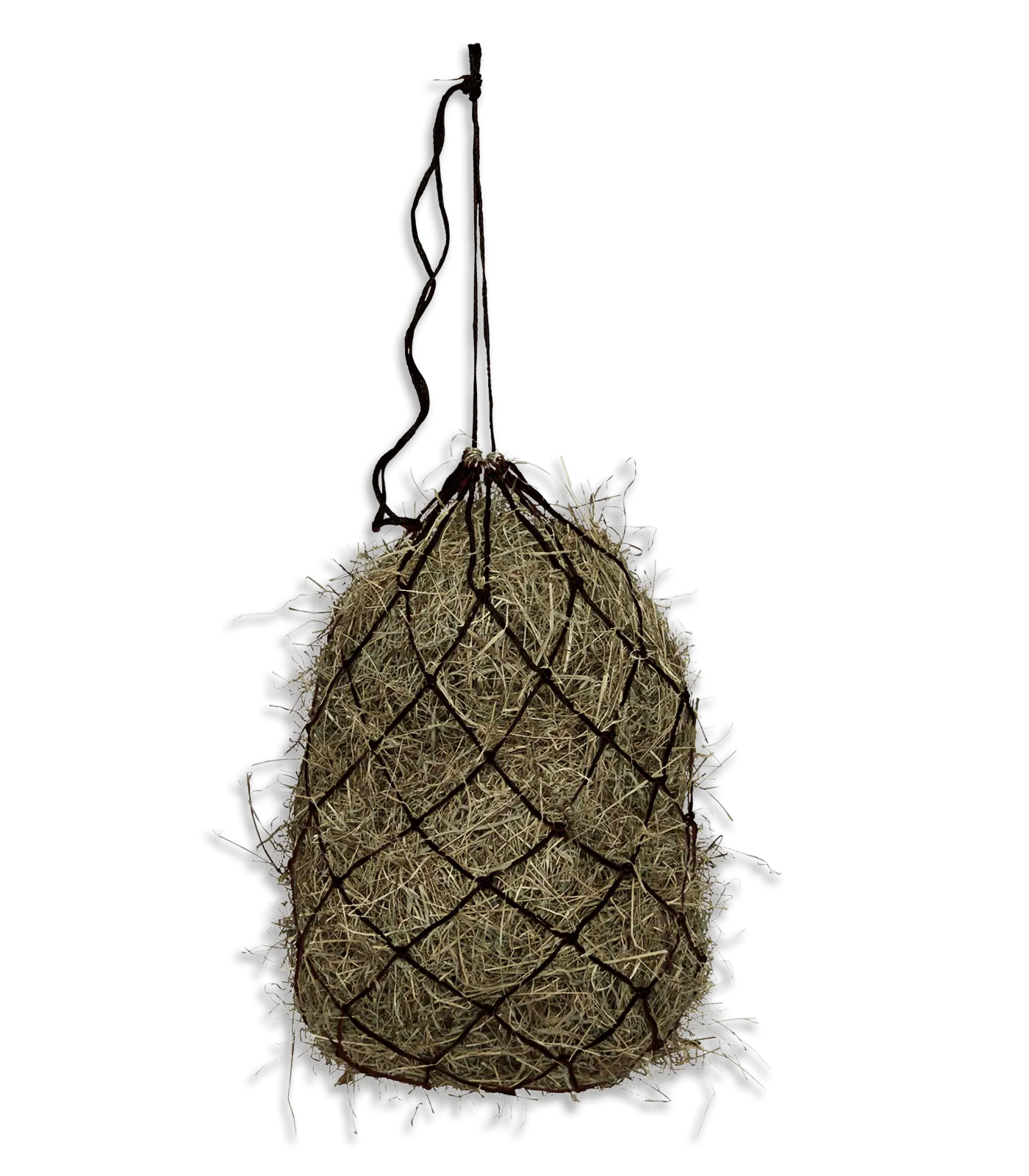 Filet à foin résistant présentant de grandes ouvertures (env. 9× 9 cm). Avec 9 anneaux métalliques.