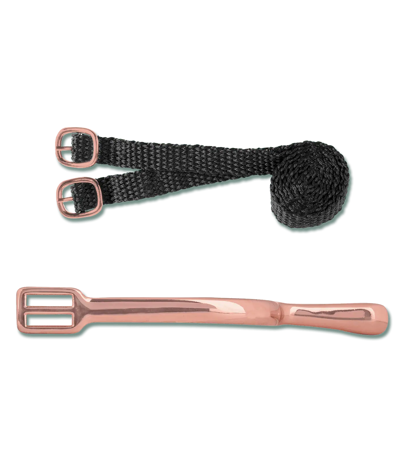 Éperon en alliage couleur or rose. Lanière en perlon équipée de boucle en inox couleur or rose. La paire.