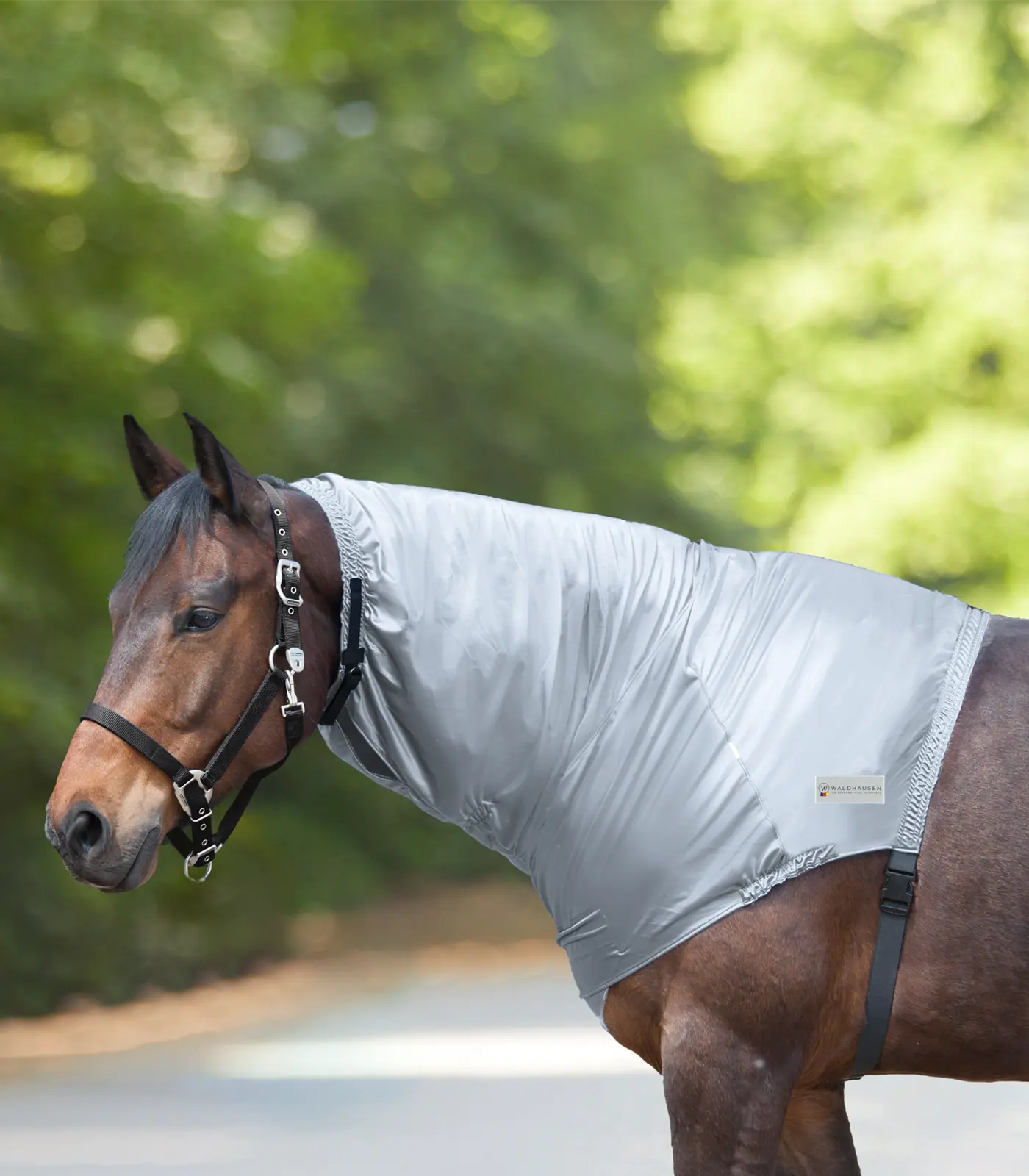 Protection complète de la crinière et de toute la zone s’étendant du garrot à la tête qui est souvent sujette aux démangeaisons. Textile fonctionnel respirant. La sangle ventrale assure un bon maintien.