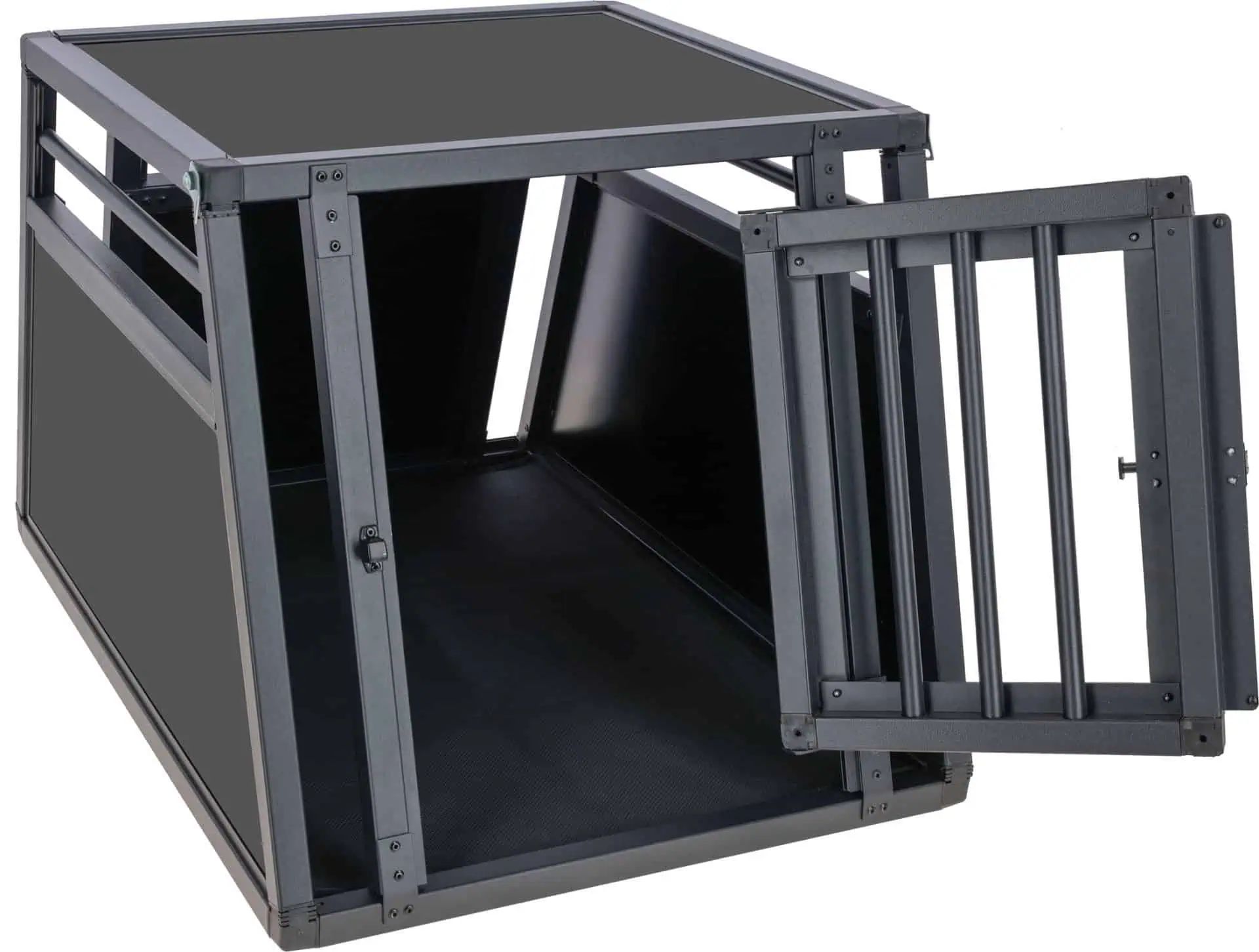 Les barres en aluminium situées sur la porte et la partie supérieure permettent une excellente circulation de l'air et une bonne visibilité. À l'intérieur, un tapis antidérapant en caoutchouc synthétique ajoute un niveau de confort supplémentaire. La caisse est équipée d'une porte avec système de verrouillage rapide et des surfaces lisses facilitent le nettoyage. Le montage rapide et facile rend la caisse de transport en aluminium Vacation particulièrement conviviale.