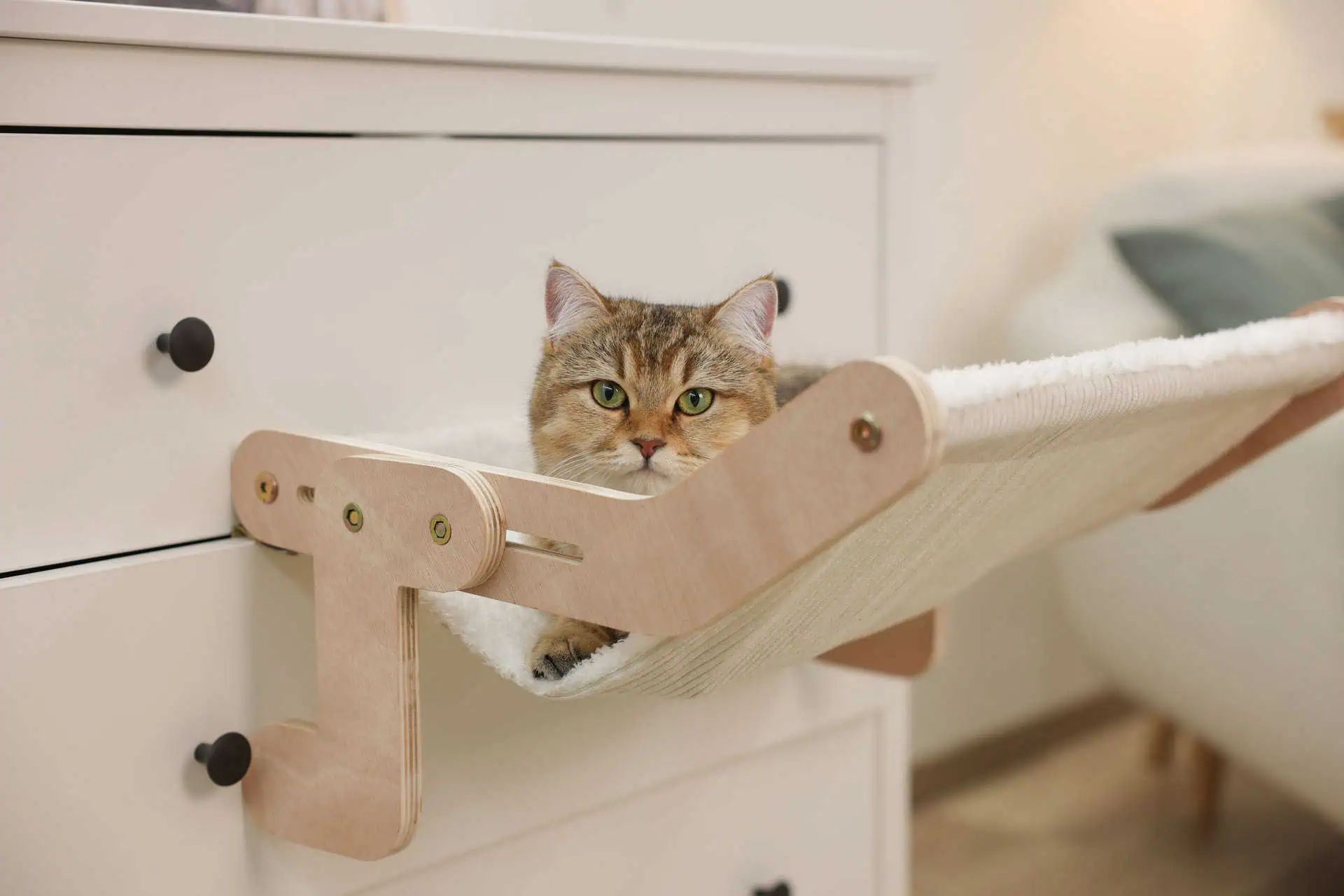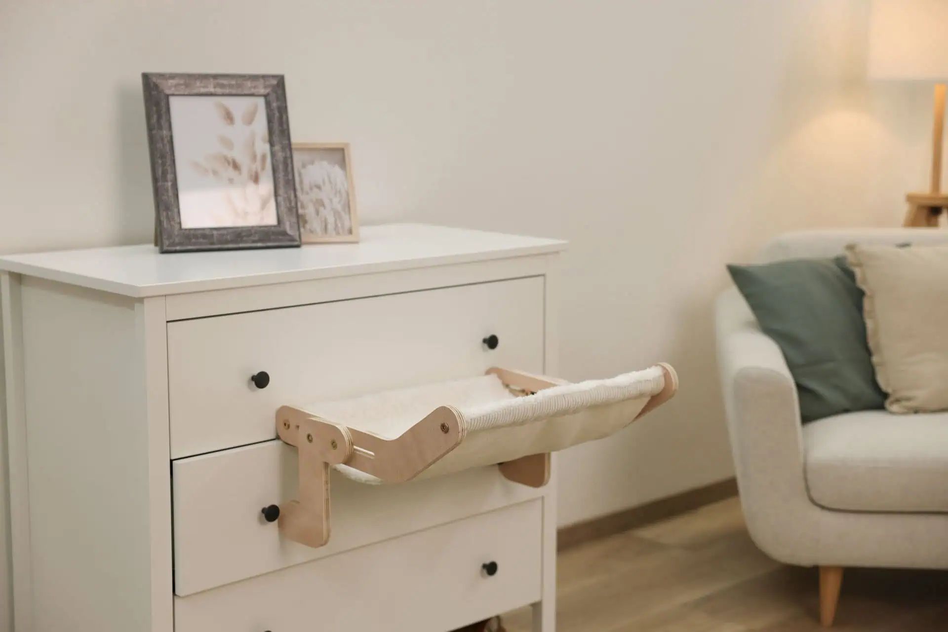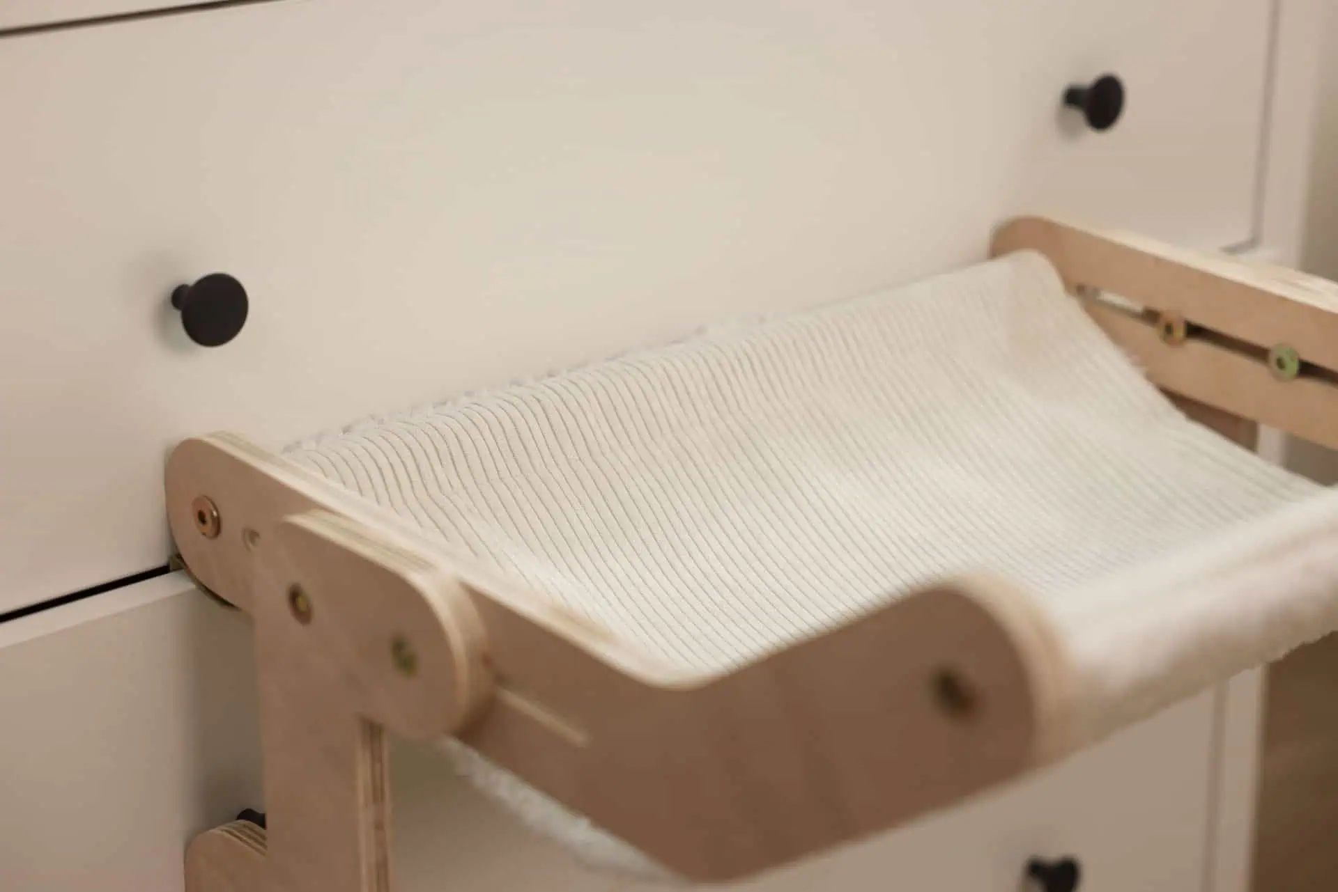 Réponse : Le hamac en bois Nap se fixe facilement aux lits, commodes, armoires et tiroirs. Aucun perçage n'est nécessaire.