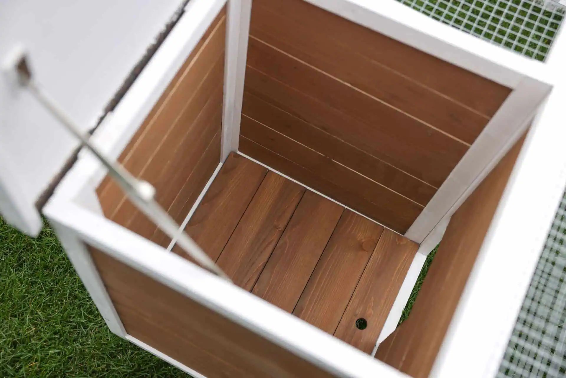 L'enclos extérieur avec abri intégré offre à vos animaux un grand espace avec suffisamment de place pour leurs besoins quotidiens en matière de mouvement. Il est composé d'une maison en bois de haute qualité avec un plancher, offrant une protection optimale contre le vent et les intempéries tout en servant de refuge confortable. Le toit grillagé de l'enclos et le toit de l'abri peuvent être ouverts par le haut pour un nettoyage facile. Grâce aux ouvertures sur les éléments avant et latéraux, l'enclos peut être facilement raccordé à un clapier à lapins. Le grillage à mailles serrées et le toit grillagé verrouillable protègent également vos animaux des intrus indésirables.