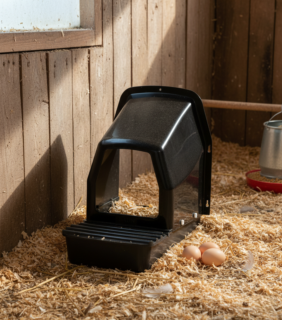 Le nid de ponte est fabriqué en plastique recyclé, ce qui est non seulement respectueux de l'environnement, mais garantit également une longue durée de vie et un nettoyage facile. Avec une taille de 37 x 44 x 50 cm, il offre suffisamment d'espace pour jusqu'à 5 poules. La construction stable assure un environnement sûr, et la boîte de récupération rend la collecte des œufs simple et efficace.