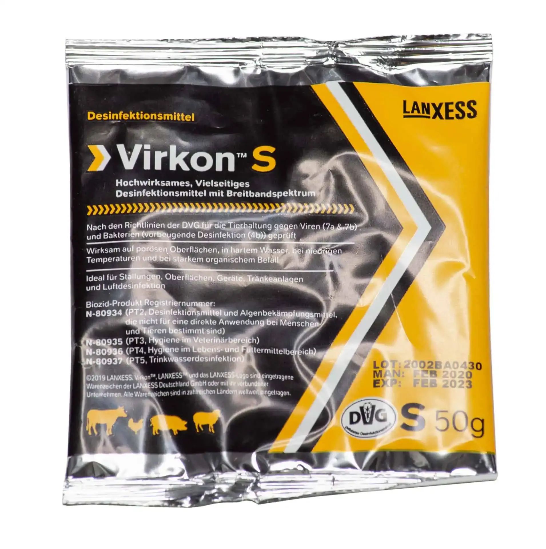 Il convient de souligner la composition efficace du Virkon®S contenu, qui est utilisé à une concentration de 1% et suffit pour jusqu'à 20 litres de solution. Ce désinfectant a une efficacité prouvée contre la maladie de Newcastle en 15 secondes, la grippe aviaire H7N9 en 15 secondes, la peste porcine africaine en 15 secondes et la fièvre aphteuse en 30 secondes.