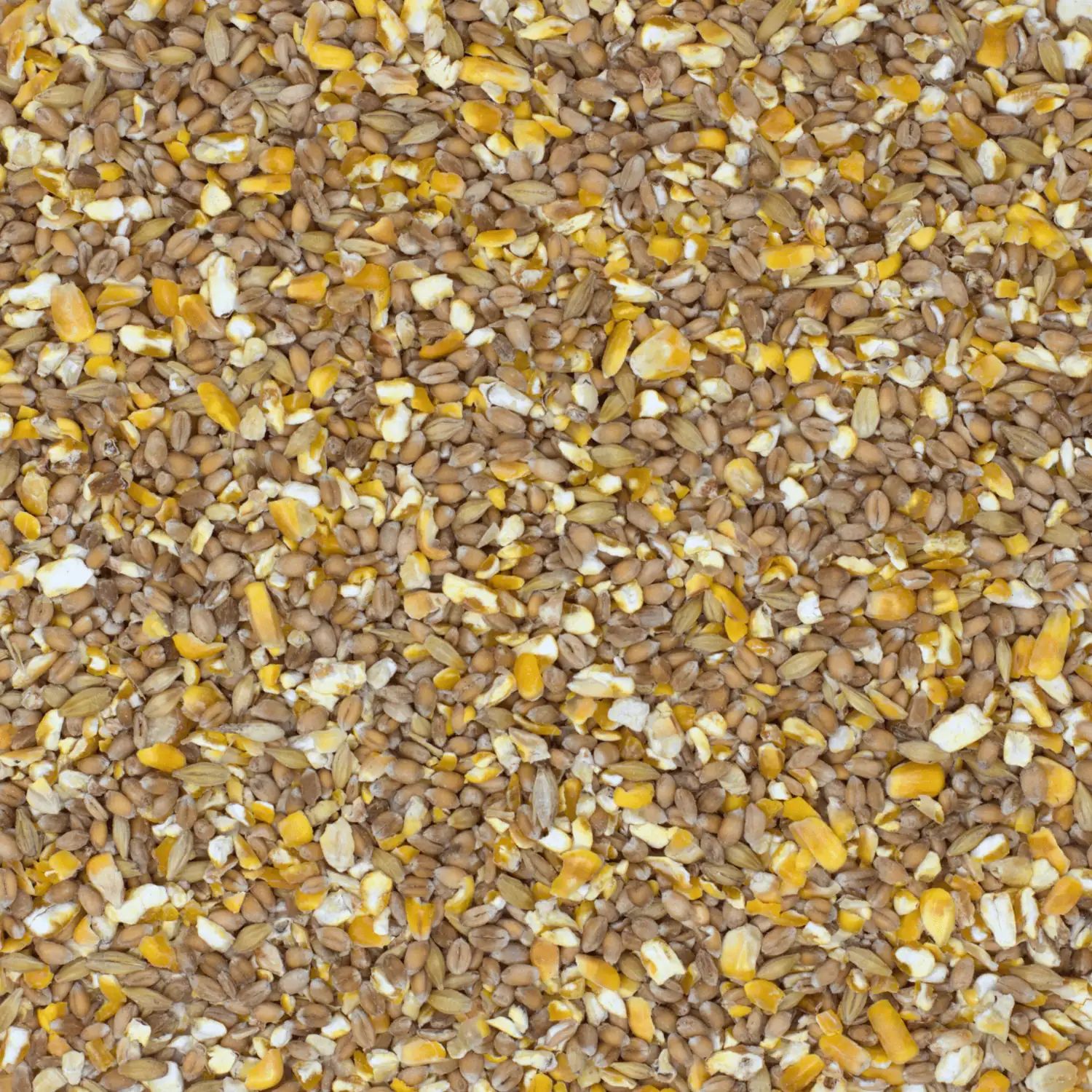 Composition : blé 45,0 %, maïs concassé grossier 45,0 %, orge 9,7 %, huile de tournesol 0,3 %.