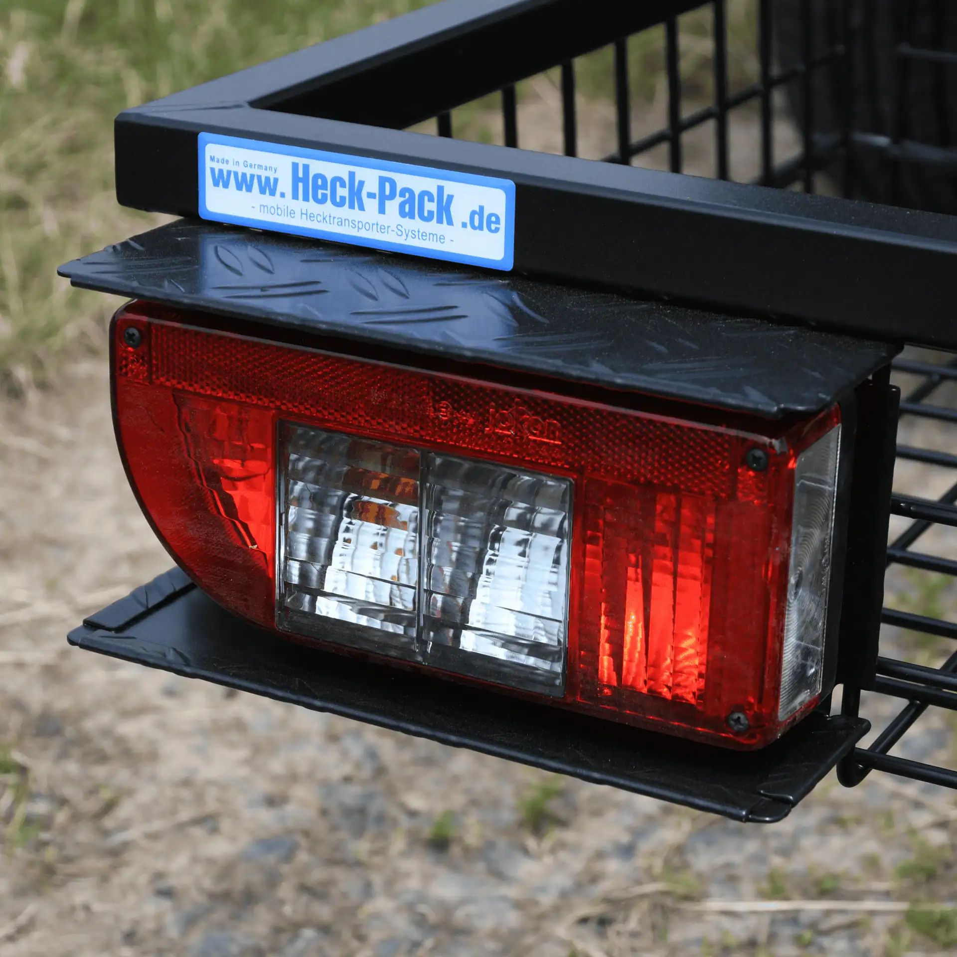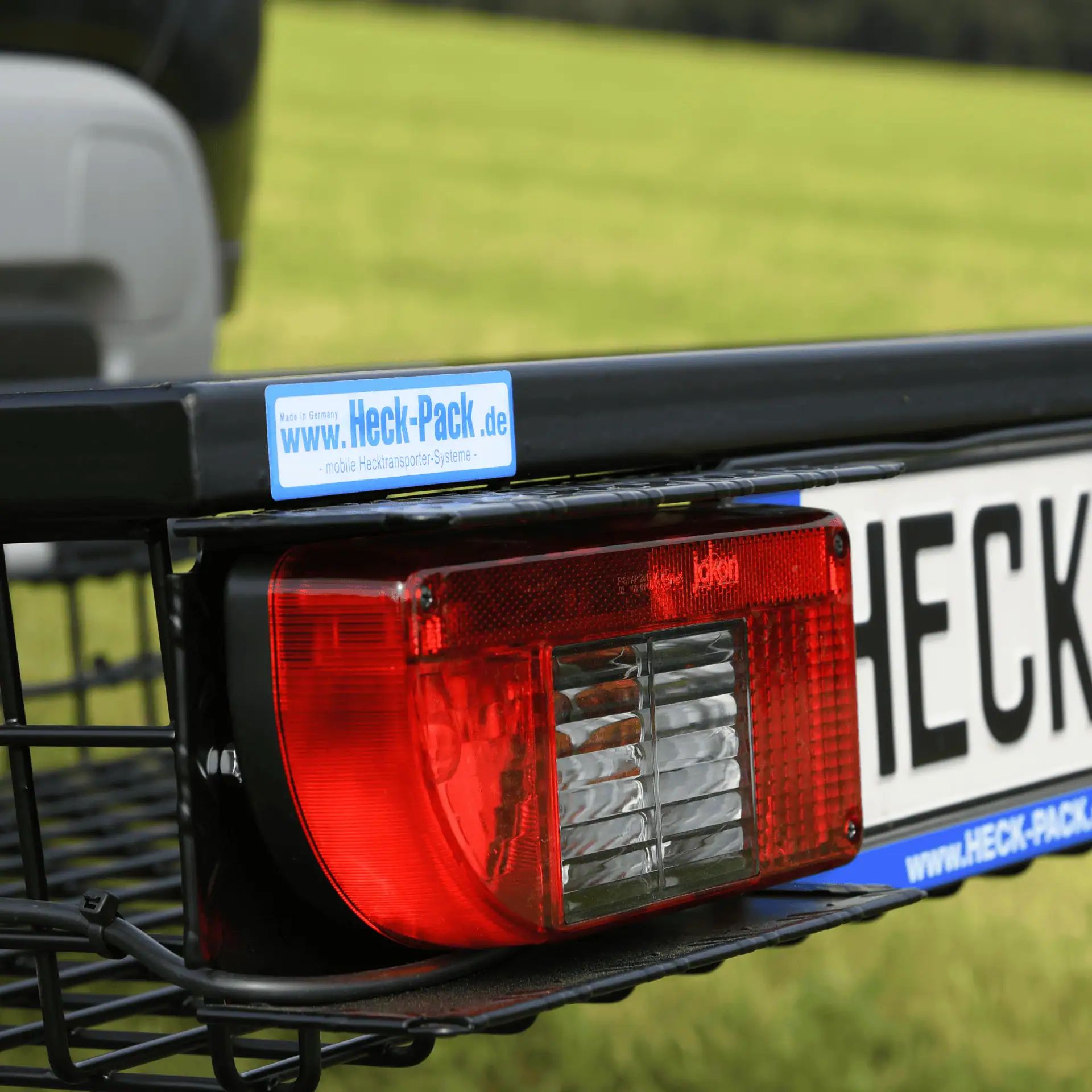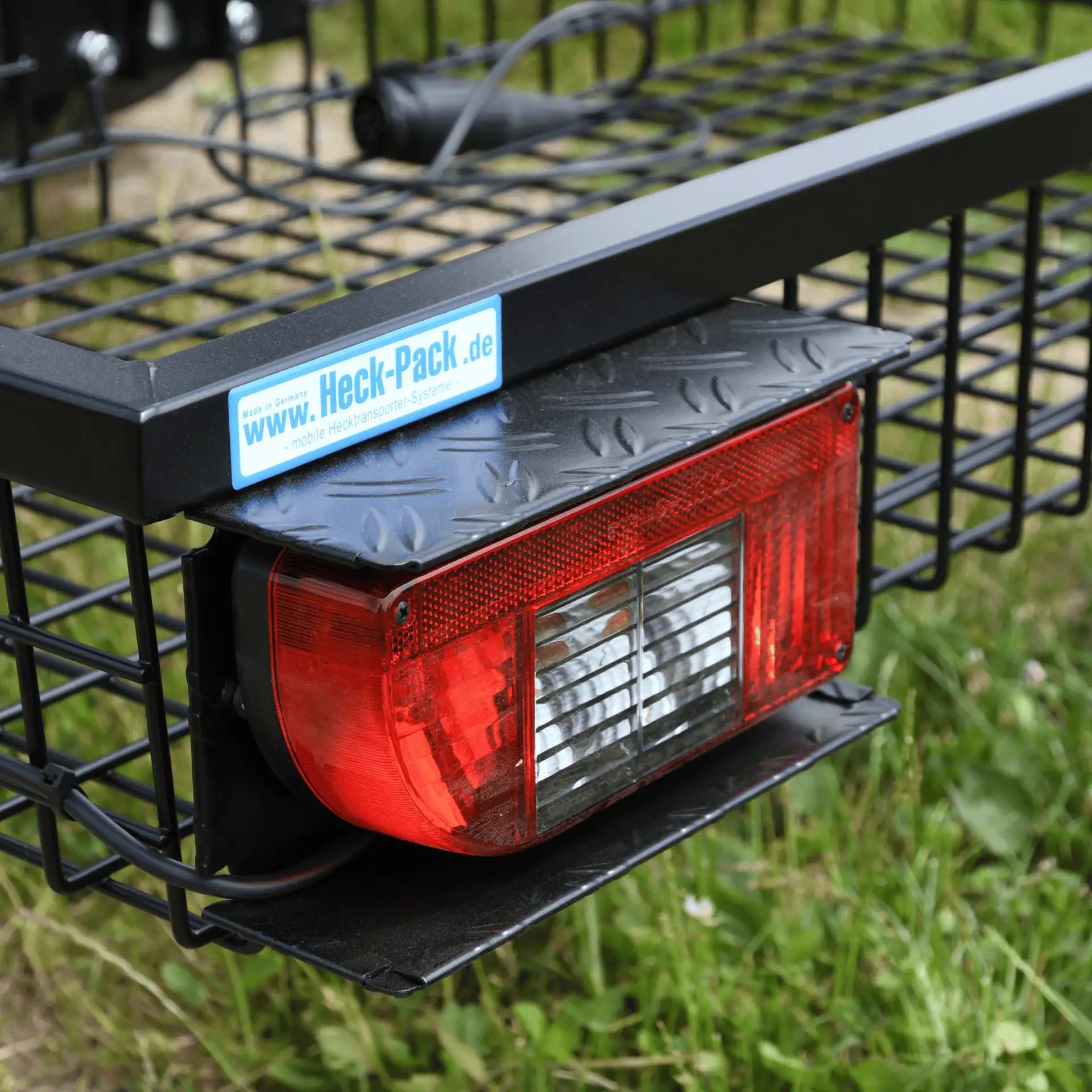 L'Éclairage de porte-bagages arrière Heck-Pack est la solution parfaite pour garantir la sécurité et la visibilité de votre véhicule. Il ne s'agit pas seulement d'un accessoire nécessaire, mais aussi d'un élément stylé qui donne à votre véhicule un look moderne. Équipé de clignotants, feux de freinage, feux arrière, feux de brouillard, feux de plaque d'immatriculation et d'un réflecteur intégré, cette unité complète fournit toutes les fonctions nécessaires et respecte ainsi les exigences légales. La protection en aluminium strié épais et résistant protège les lumières des influences externes et assure une longue durée de vie. Grâce à la peinture en poudre de haute qualité en noir mat (RAL9005) et aux plaques en aluminium pliées avec des découpes au laser précises, l'éclairage est non seulement robuste, mais aussi esthétiquement plaisant.