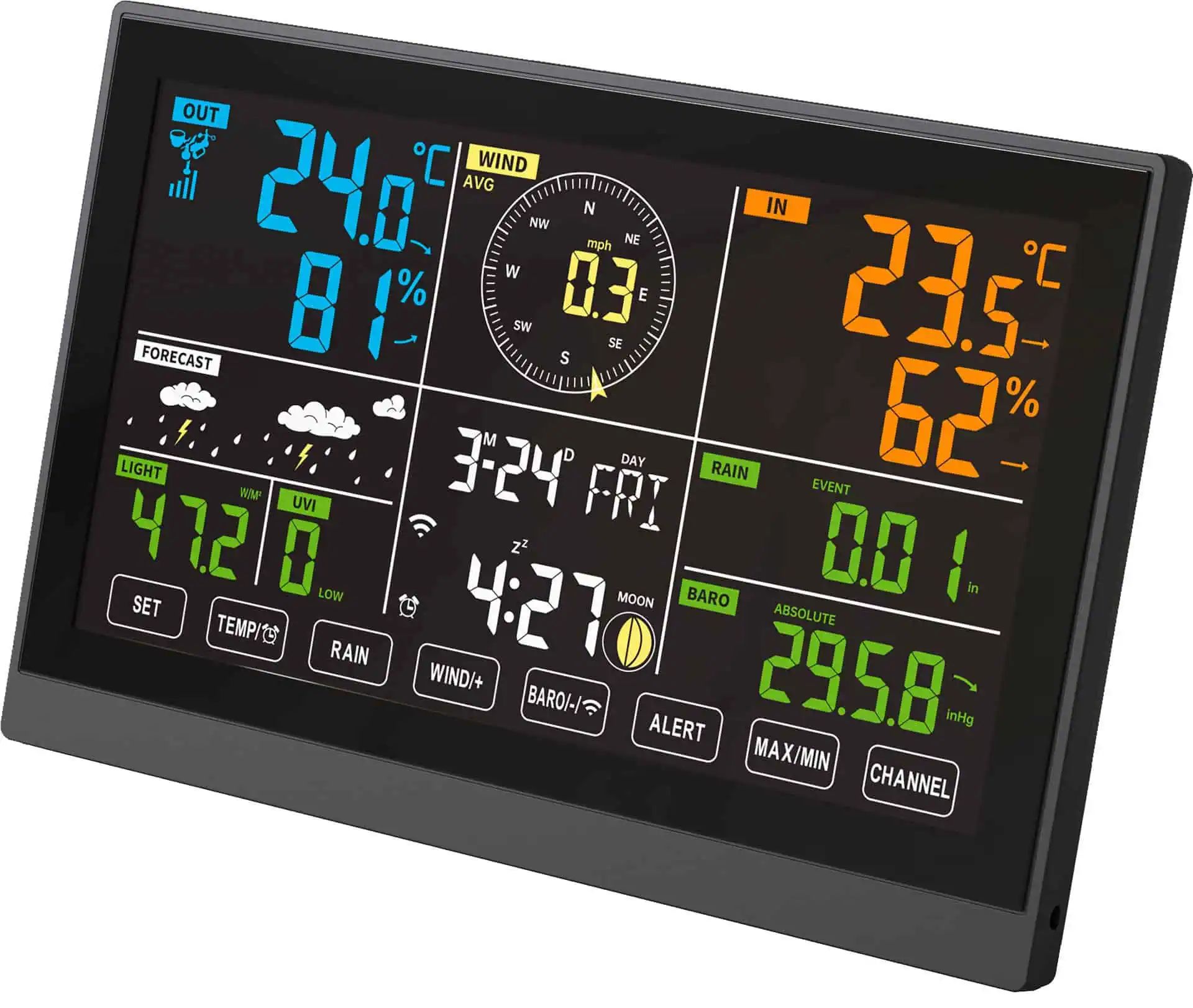 - For measuring temperature, humidity, rain, wind speed and direction, UV index, air pressure, and dew point.