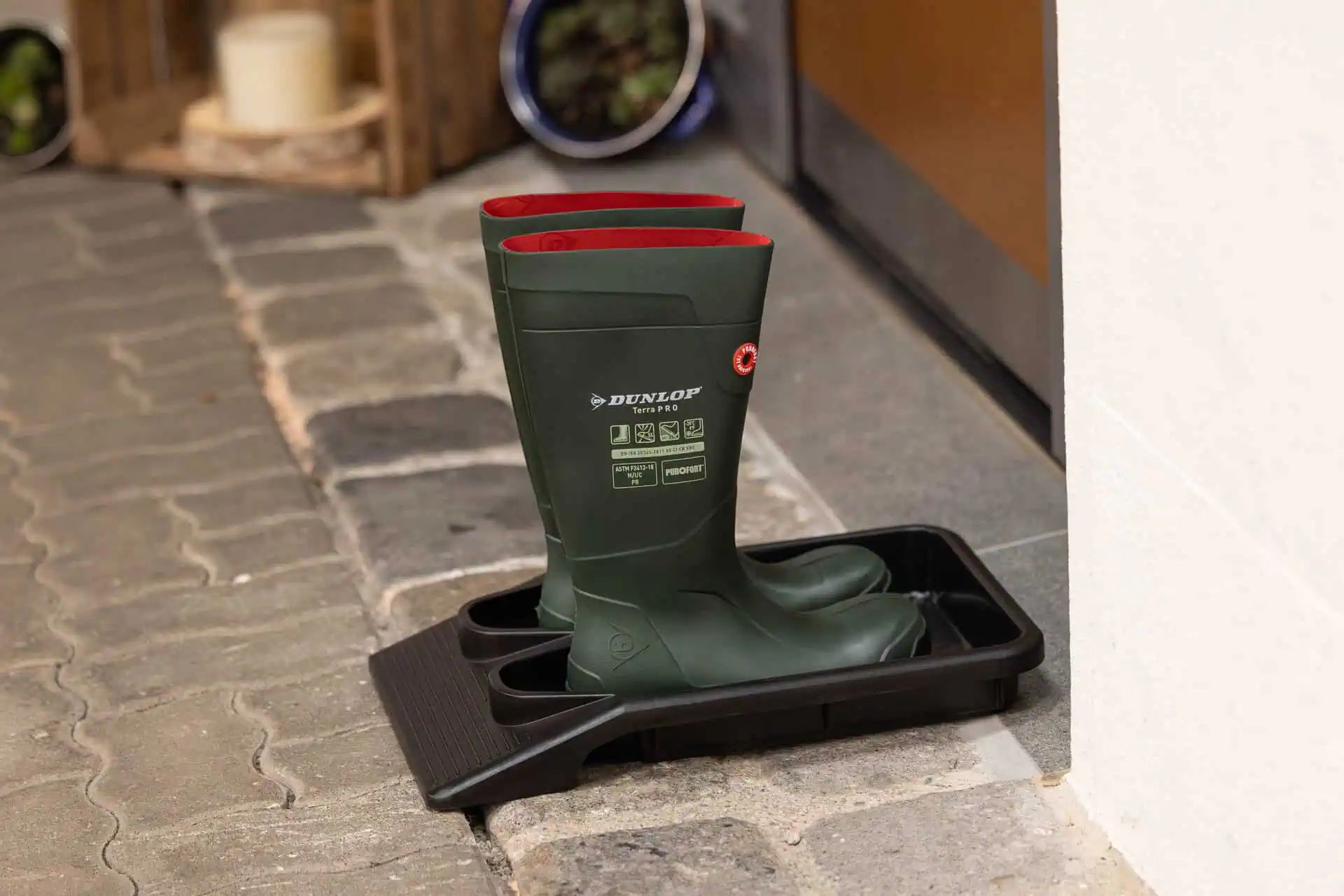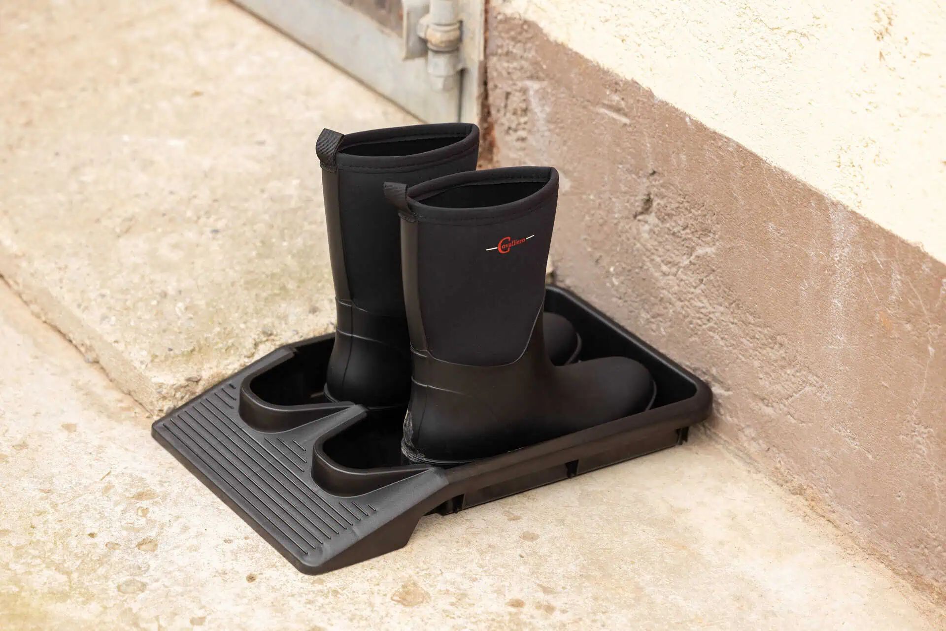 Innovative shoe and boot tray. Designed for effortless, hands-free removal and neat storage of shoes and boots.