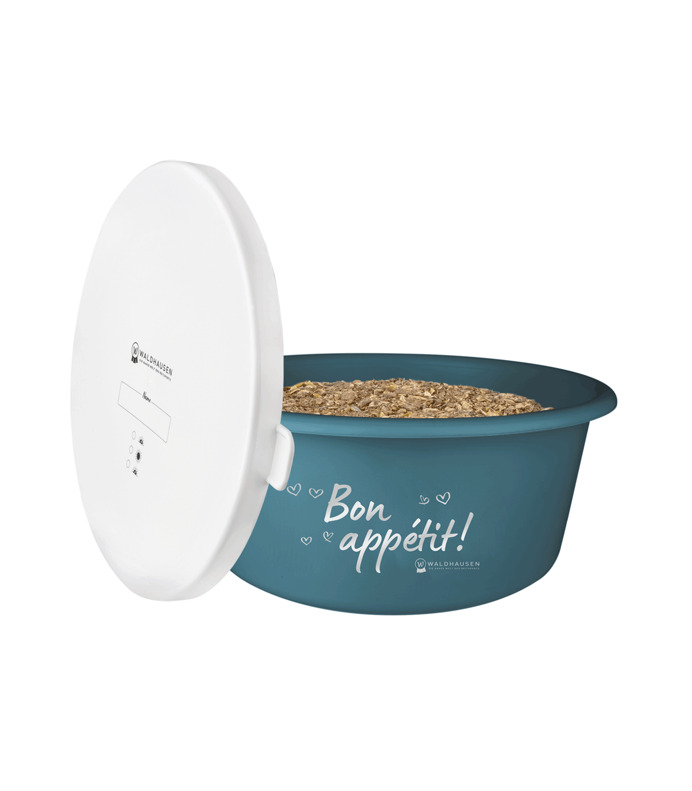 Waldhausen Mangeoire "Bon Appétit!" avec couvercle, bleu pétrole, 5 l - La protection idéale pour la nourriture de votre cheval !