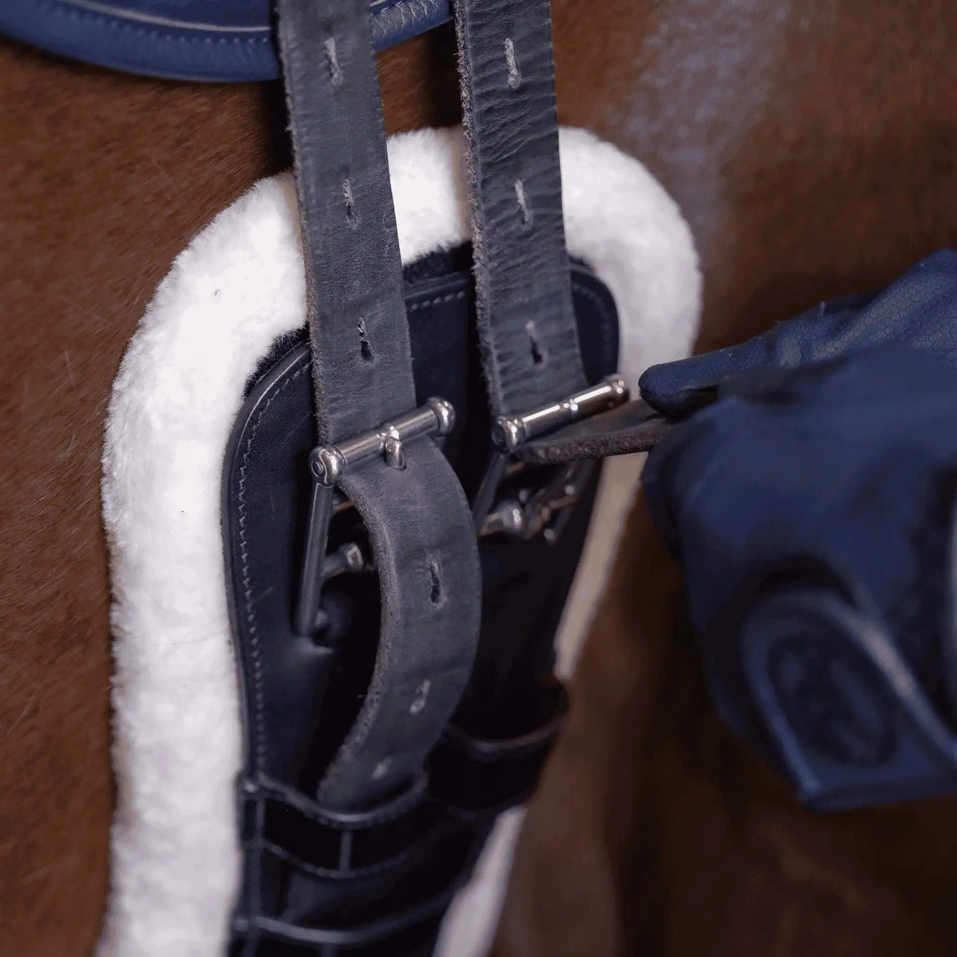La particularité : vous pouvez choisir entre trois rembourrages différents, facilement interchangeables. Le rembourrage en cuir respirant de haute qualité est principalement composé de cuir américain tanné végétal, il est durable et facile d'entretien. Le rembourrage en fourrure synthétique est particulièrement doux pour la peau sensible des chevaux et le rembourrage innovant 3D AIR® EFFECT en maille synthétique garantit une circulation de l'air parfaite et un séchage rapide, idéal en cas d'effort intense ou en été. Les détails en cuir verni sur les boucles et la pochette de rangement pratique lui confèrent un look intemporel et élégant.
