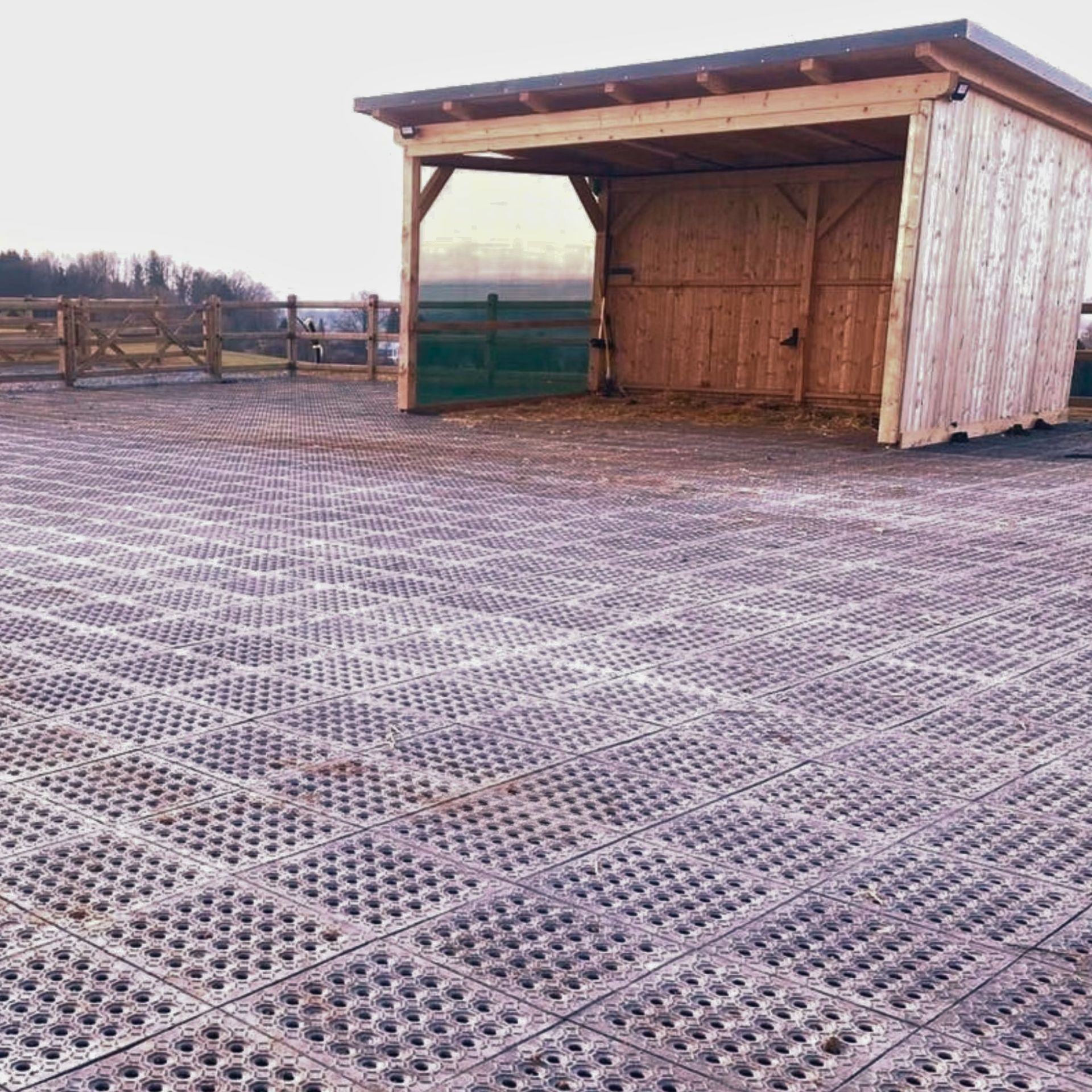 Que le sol soit en sable, gravier, gazon ou boue, vous gagnez beaucoup de temps et d'efforts lors de l'installation. Avec une capacité de charge d'environ 25 tonnes, les plaques sont parfaitement adaptées à une utilisation intensive, de sorte que vous n'avez pas à vous soucier de leur stabilité. De plus, elles sont polyvalentes et conviennent non seulement aux manèges, mais aussi aux paddocks et autres surfaces extérieures. Par ailleurs, vous contribuez activement à la protection de l'environnement, car les plaques sont fabriquées à partir de PVC recyclé.