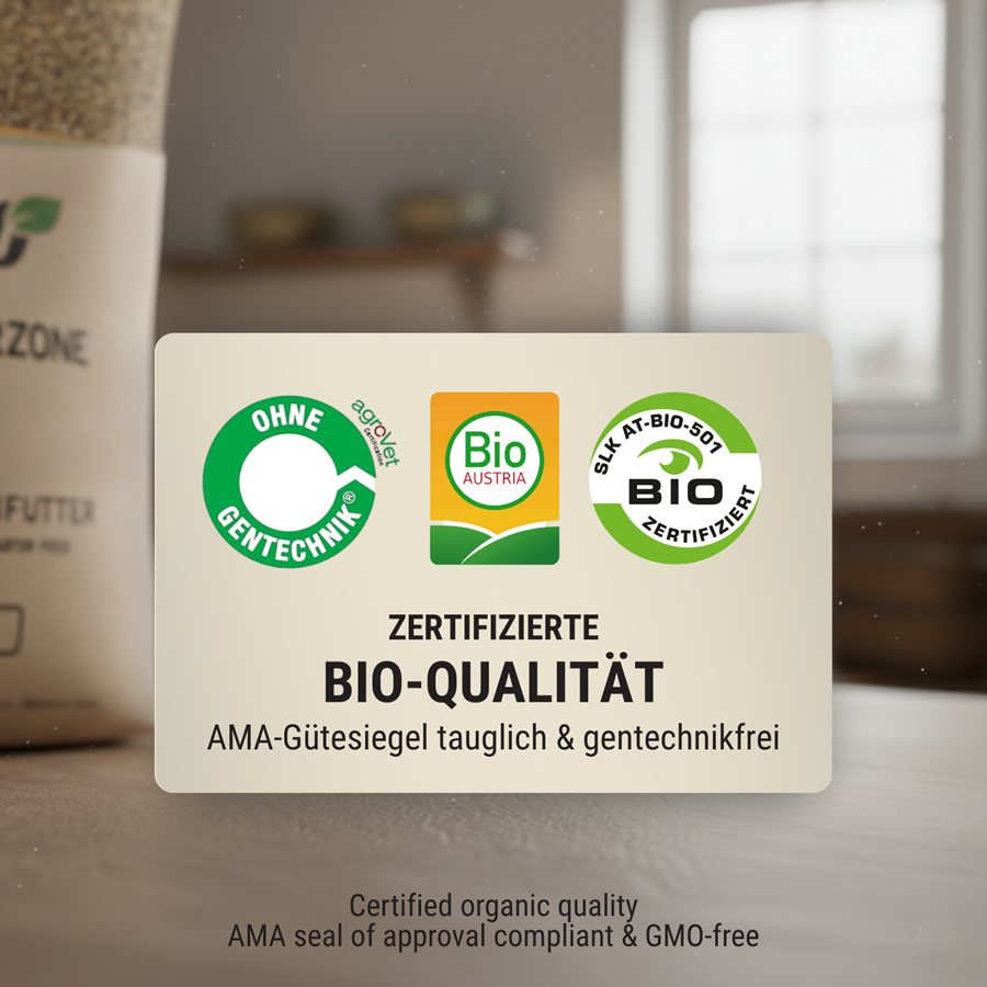 Our GMO-free feed comes exclusively from organic farming and is suitable for the AMA quality seal. This stands for the highest quality and transparency of origin.