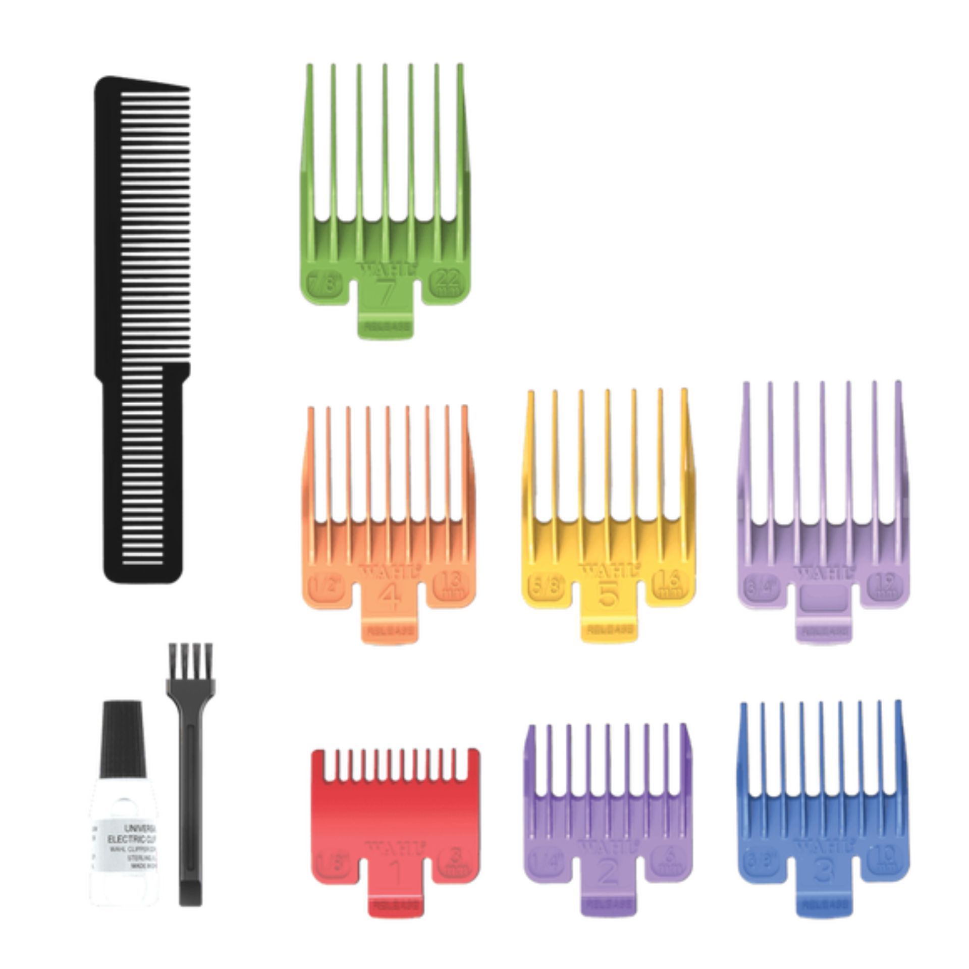 La tondeuse dispose d'un système de réglage offrant 3 longueurs de coupe précises, tandis que les 7 peignes-guides colorés (3, 6, 10, 13, 16, 19 et 22 mm) permettent un réglage adapté à chaque longueur de poil.