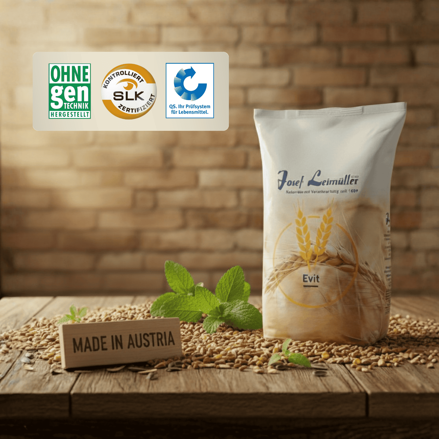As a family business, Leimüller has been producing fresh and natural animal feed in Neumarkt am Wallersee for over 400 years. We stand for absolute transparency and only use high-quality, regional raw materials that pass our strict quality control. Our promise: The feed is guaranteed dust-free and GMO-free, which is monitored and certified by SLK GmbH. Many products are eligible for the AMA quality seal and our QS certification guarantees you adherence to the strictest quality standards.