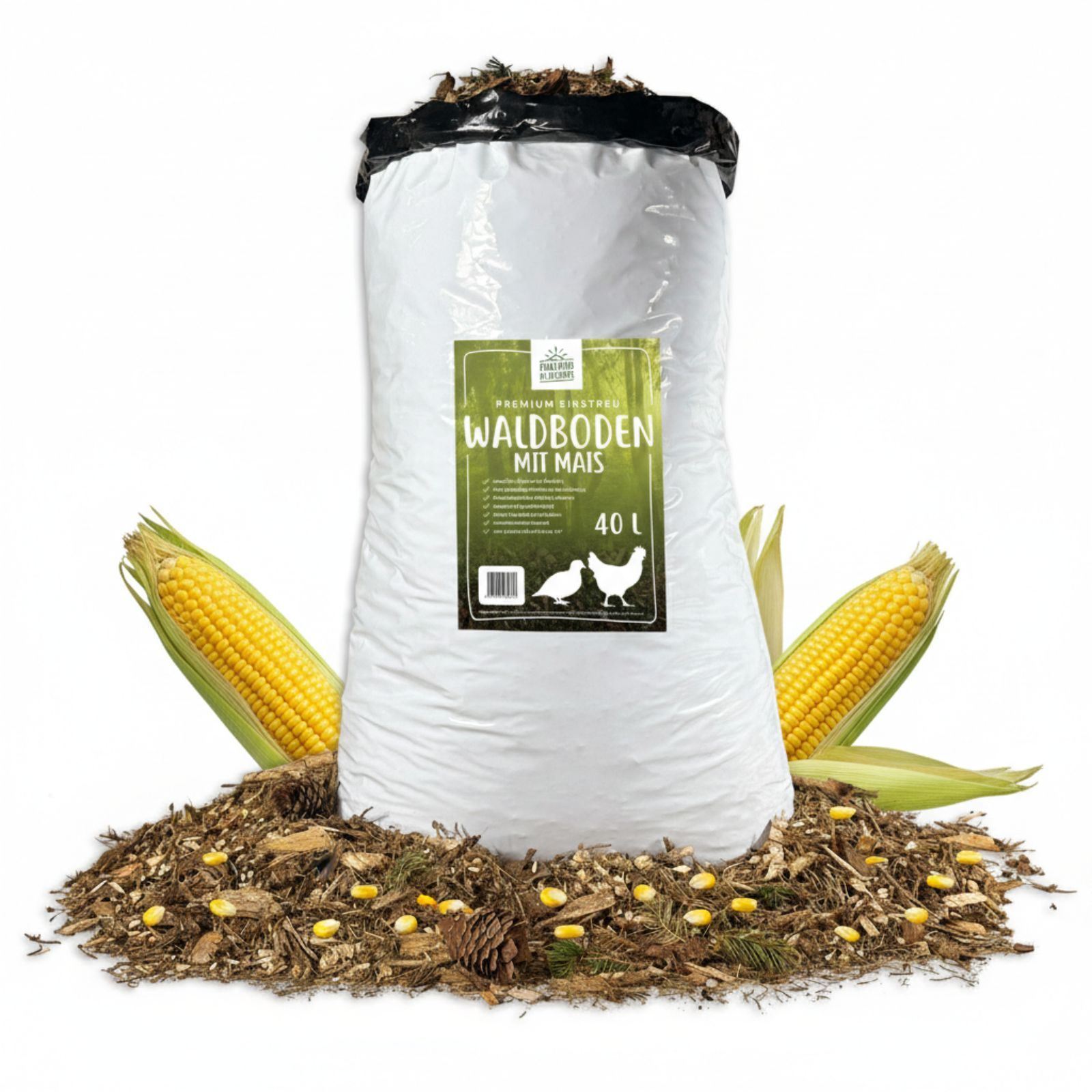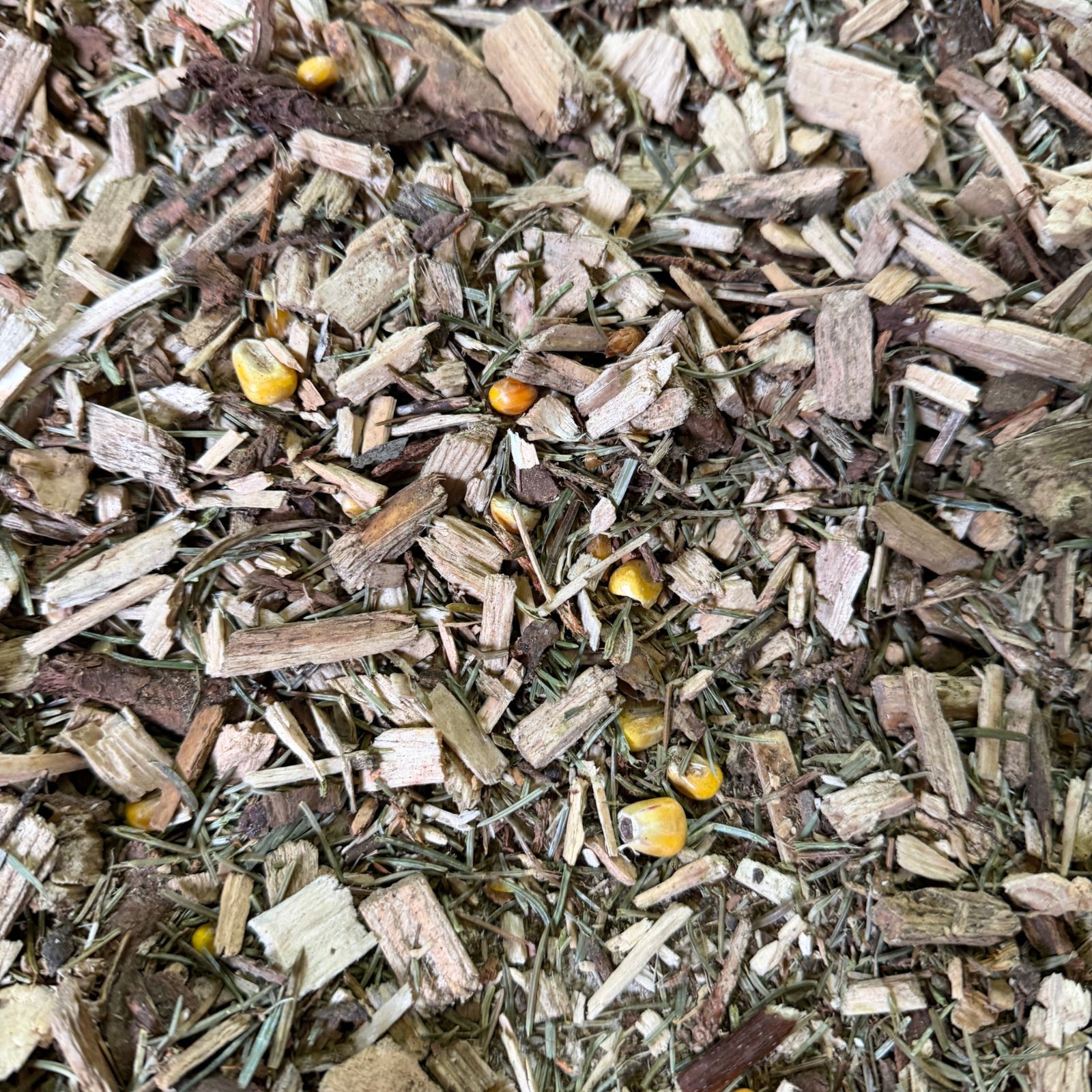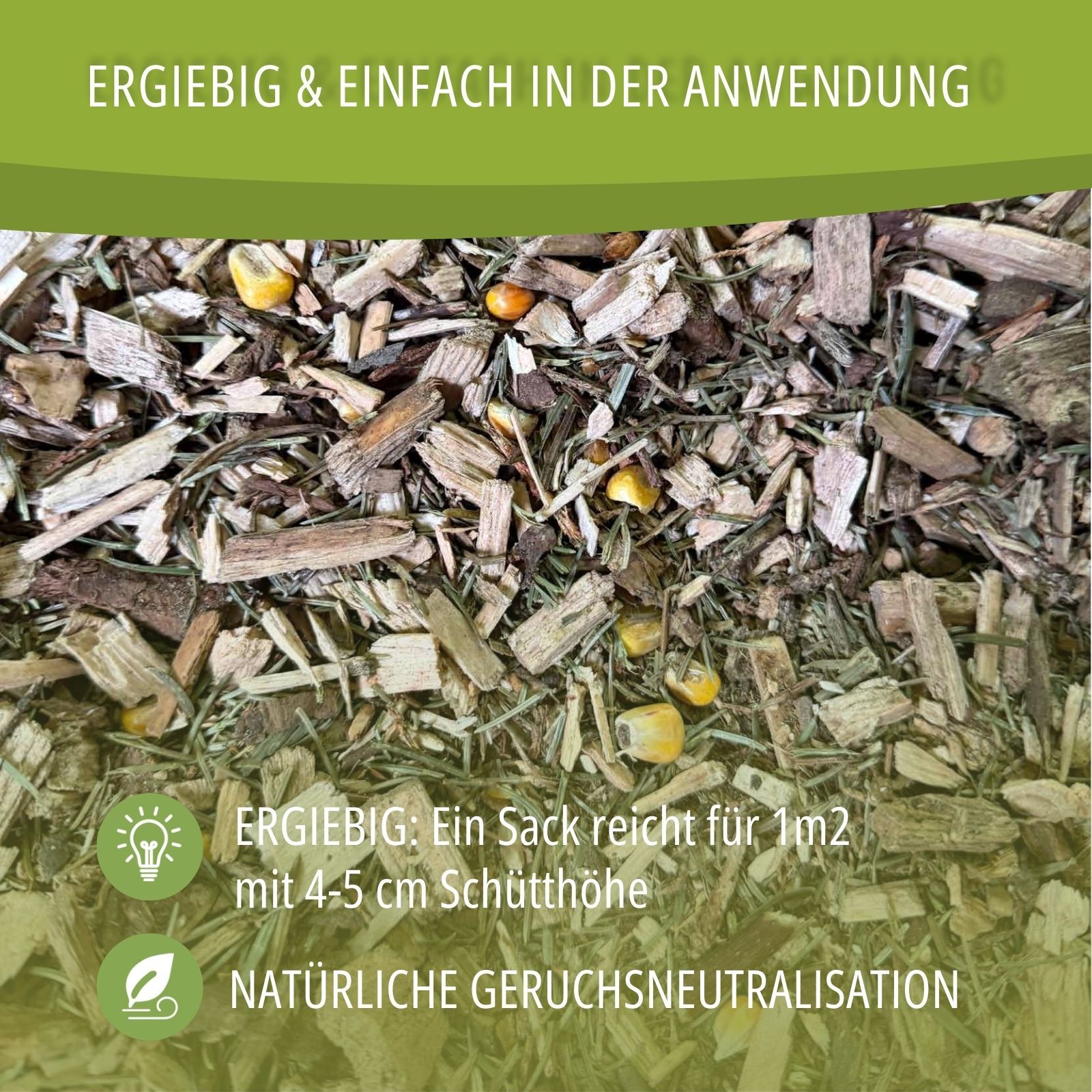 The special feature of this bedding is the integrated occupational therapy. The added corn acts as an energy snack in small quantities and animates your animals immediately. This promotes active pecking, scratching and natural foraging, preventing boredom in the coop from the start. You offer your animals species-appropriate enrichment, which ensures mental stimulation and well-being and supports instinctive behavior.
