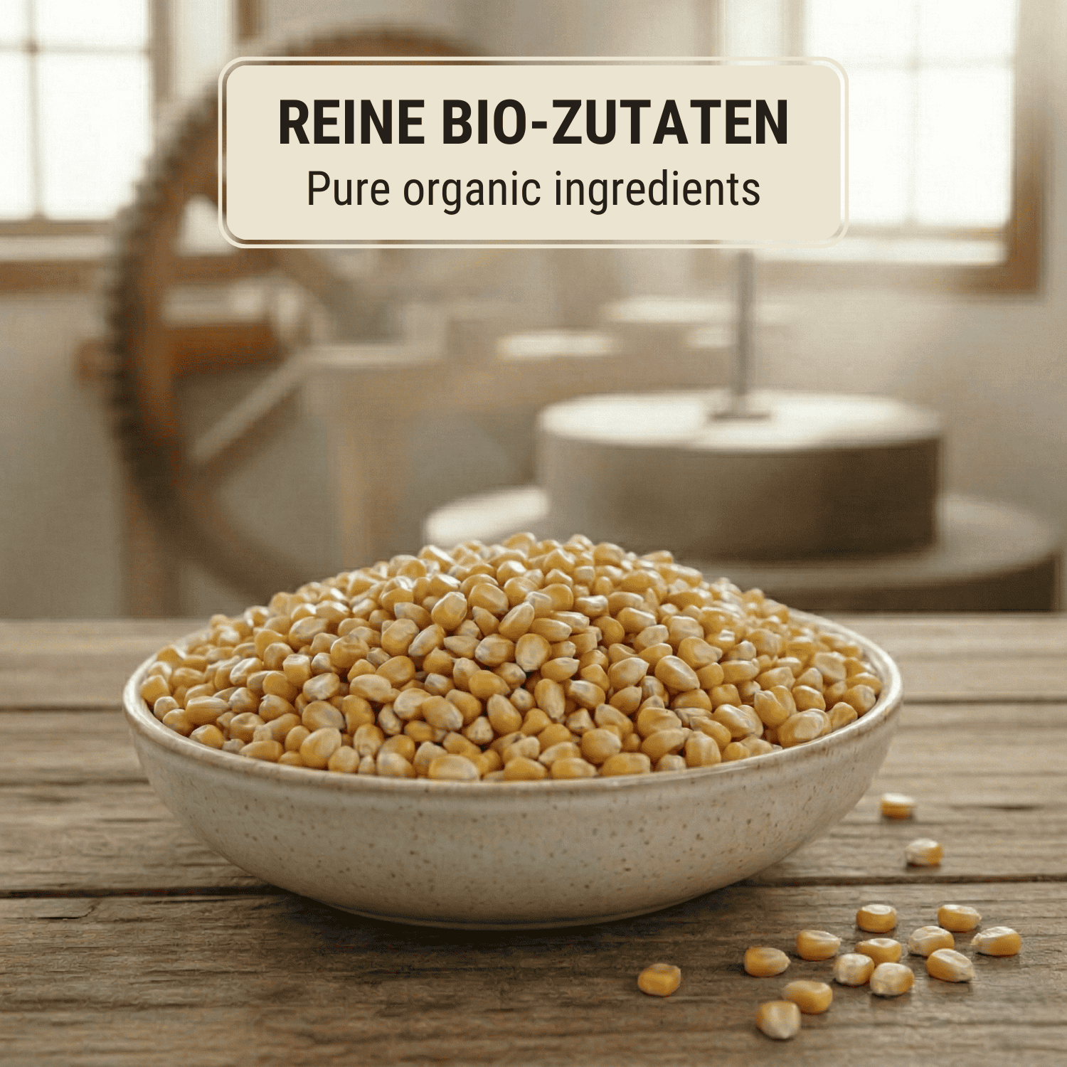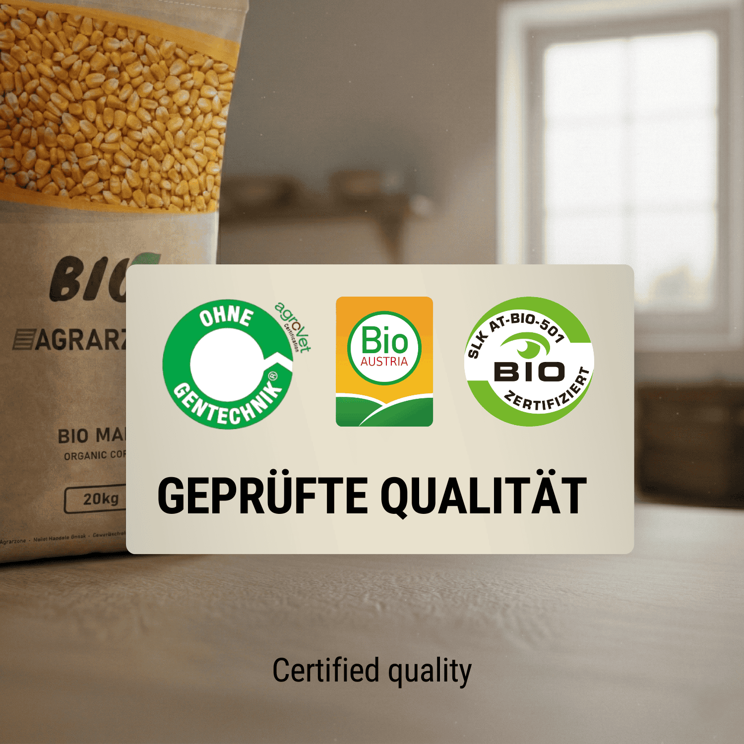 Pour cet aliment, vous pouvez compter entièrement sur une qualité 100 % biologique en provenance d'Autriche. Le maïs provient d'agriculteurs régionaux certifiés et est produit selon les critères stricts de Bio Austria et de l'organisme de contrôle SLK. Cela vous garantit un aliment totalement exempt d'OGM et cultivé sans l'utilisation de pesticides chimiques, ce qui protège non seulement vos animaux, mais favorise également une agriculture durable.